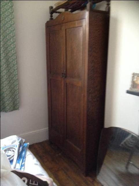 1940's vintage single wardrobe. This is a good, solid piece of furniture. You could have some extra fun with it if you were to try adding a "shabby chic" effect. It's currently blocking my hallway, so if you can collect it before anyone else it's yours. I'm available any evening this week.