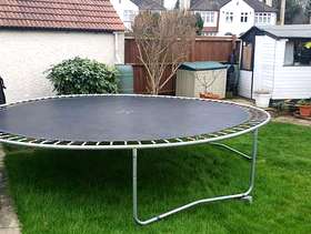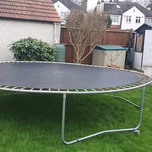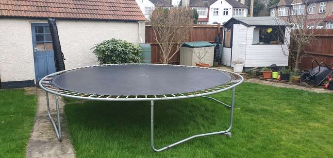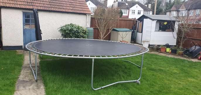 14 ft trampoline with ladder - max load 200kg TUV GS EN-71 CE Certified Diameter: 14 feet; * Height: 35 inch; 4 "W" legs, 88 pcs x 135mm length steel wire galvanized springs Jumping mat made of A grade Permatron Polypropylene from the United States, High weight loading, can take adults of up to 200kg (approx 31 stone), Frame/Connecting/Leg tubes: 38.1mm x 1.5mm (galvanized both inside and out), free ladder I have all the surrounding poles but the blue frame around them are not there anymore. I have included the original picture just to give you an idea of it looked like. You can buy all the bits (padding and net) online. Our kids did not need them since they were 8 and 9 years old. Will consider delivery to within 3 miles of BR1 4LH but I will not reassemble. (Can only reassemble for (£15) If you have any query please contact me on 07979696875 Collection from BR1 4LH