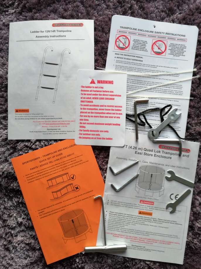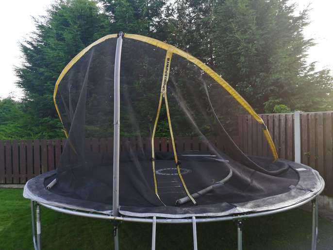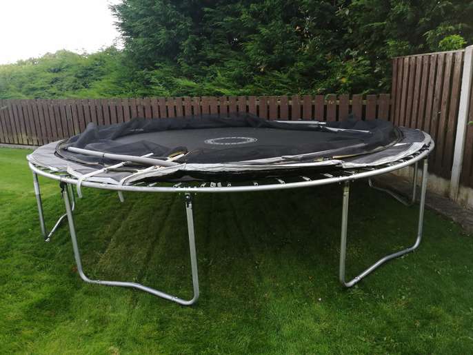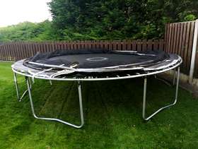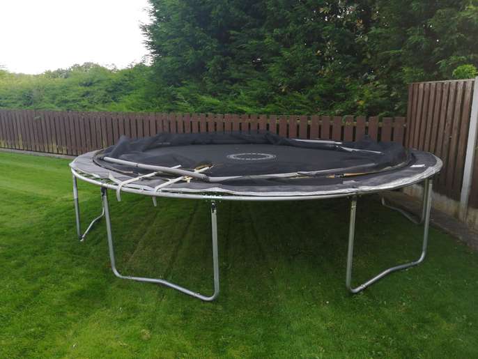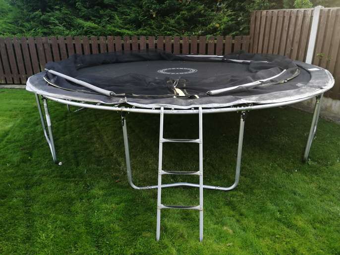 14 ft trampoline with enclosure, ladder and original assembly instructions and tools. 2 of the net supporting poles regrettably have snapped as you'll see in the photos but I think if someone can weld, they can easily repair them. Alternatively, the trampoline can be used without the net or with the net just supported by the remaining 4 poles which will also work. The net is complete i.e. not ripped. The poles still have all their protective foam around them. Note: buyer to collect and disassemble.