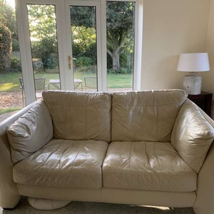 2 Cream leather two seater sofas Good condition - some wear on seat pads Measure H 71cm. W165 D91 Collection only and will need transport Need to be collected within next few days as new furniture arriving.