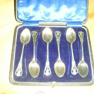 Boxed set of fruit spoons complete with fruit knife also set coffee spoons they may not be antiques but they definitely old!! both immaculate, complete and still in original boxes