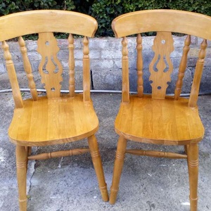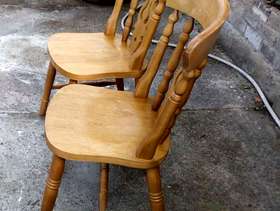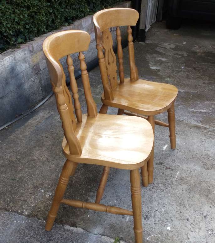 2 solid wood dining chairs - used but in good condition. Possible Upcycling project - sand and repaint/revarnish. Dimensions H 34" W 15.5" Collection required.