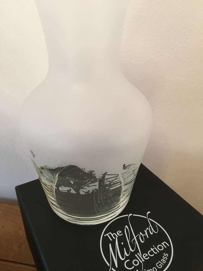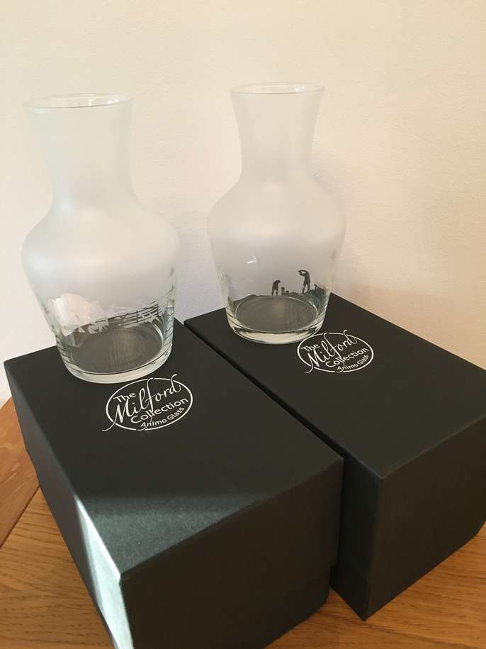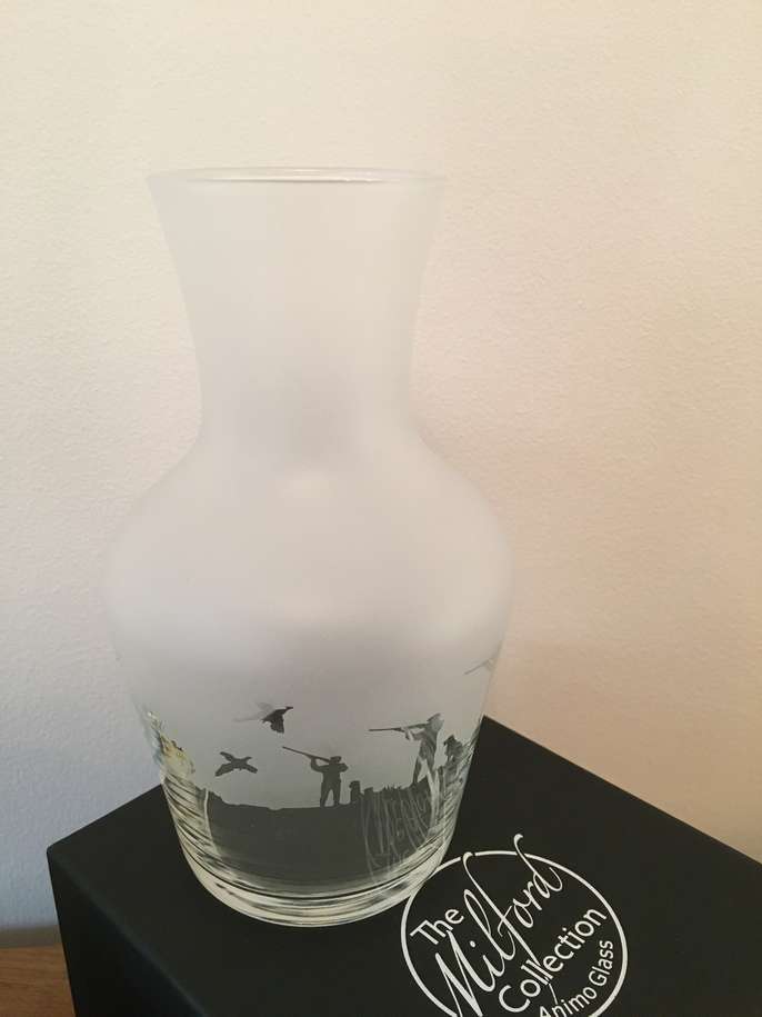 2 x Brand New (Boxed) Milford Animo Glass Carafes Crystal Glass with sand blasted Shooting Frieze Please see the last photo - the boxes have slight dent on the corner due to bad packaging (not mine!!) Excellent Christmas gift
