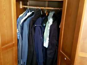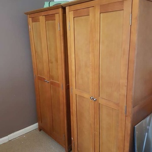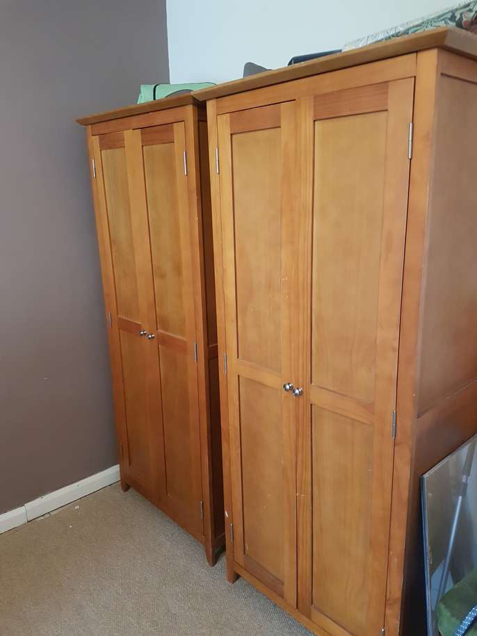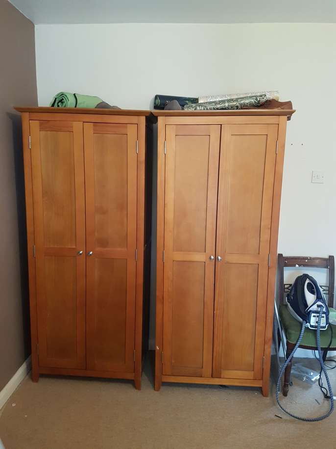 Signs of use with small dents and marks but overall good condition and would look nice painted up! Each one has a hanging rail and top shelf. Height is 180cm, width is 81cm (from the each side of the top surround), depth is 49cm. All external measurements. Can sell separately if you just want one.