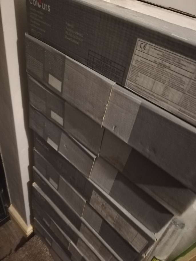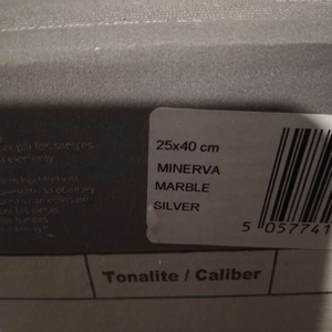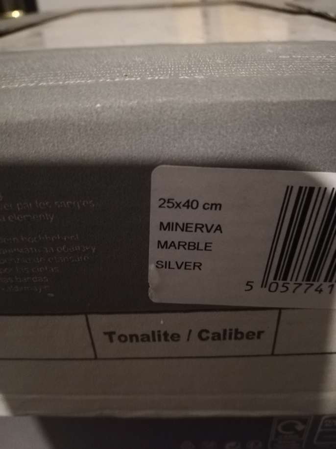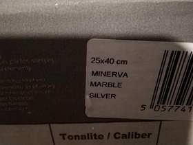 25 packs of minerva grey and white marble effect tiles, single tile size 25 x 40 cm, each pack contains 10 tiles. Brought for bathroom project but loads left over, too late to return.