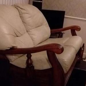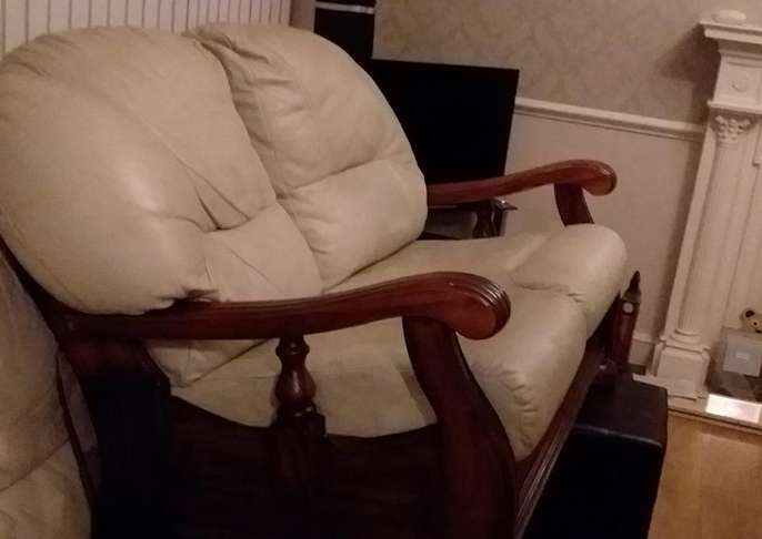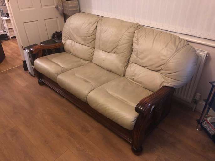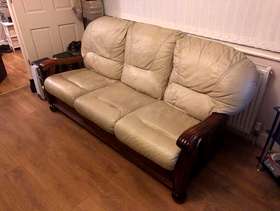 Cream leather 2 seater and 3 seater sofa with wood frames. In decent condition. Removable covers. Collection only.
