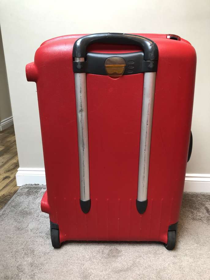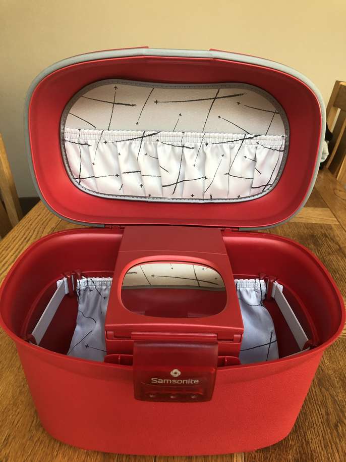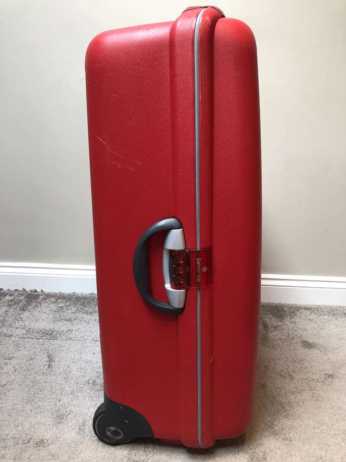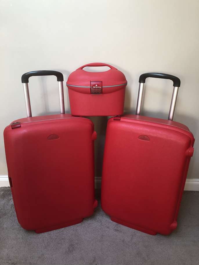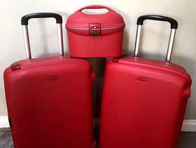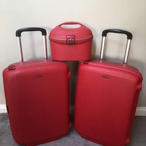 Set of 3 Red Samsonite Travel/Vanity cases with 2 wheels & retractable handles. Hard shell and waterproof all with secure combination locks which have been reset to” 000” 2 large cases - 70cm x 53 x 30 1 vanity case as picture including make up tray. No longer required . All have been used & hence show travel scratches. Selling as 3 pieces but can split as prices below Price: £65 for all 3 or £25 for each large case & £20 vanity case