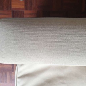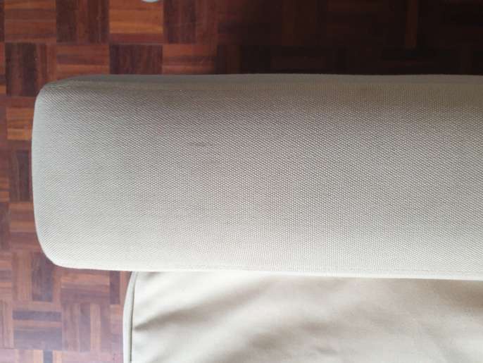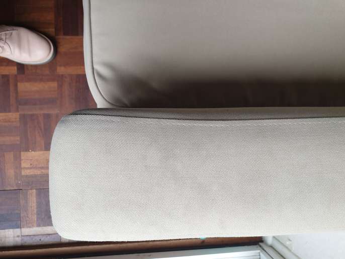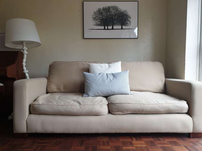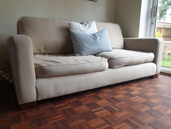 Beige coloured fixed covered 3 seat sofa with dark wood feet. Size D94cm, W195cm and H85cm. The seat covers can come off and go in a washing machine. The sofa is about 7 years old from sofasofa. A little stained on the arms and fronts of seat covers from daily use but still in good condition and comfortable. Collection only.