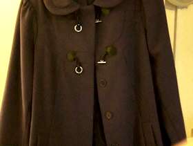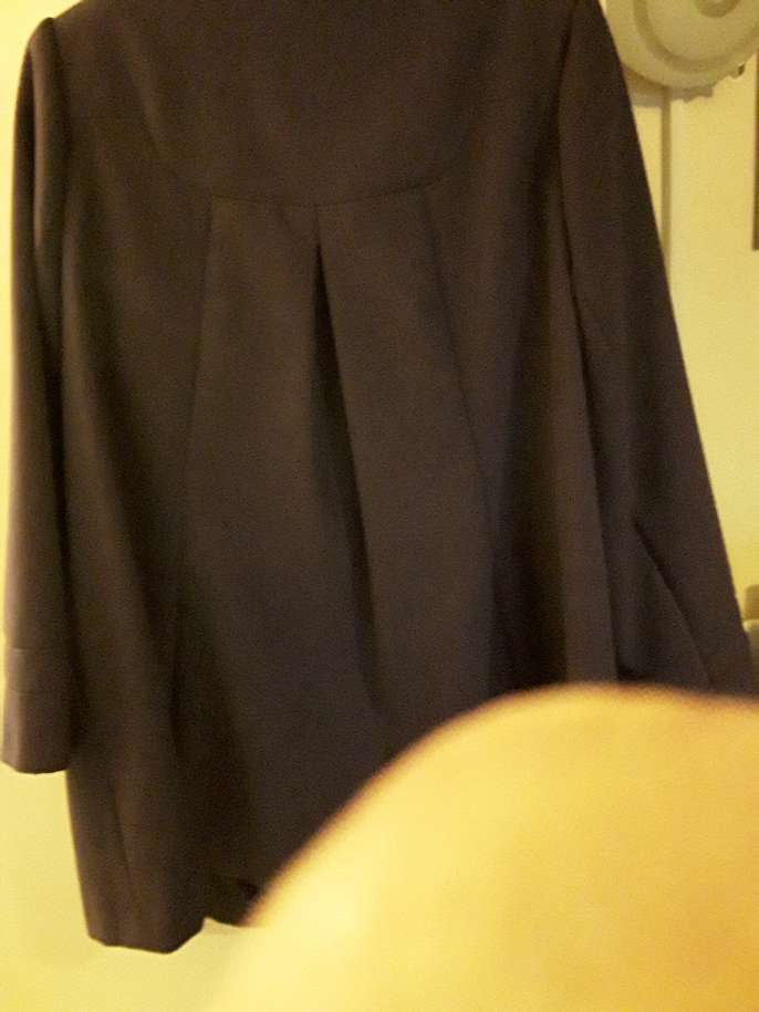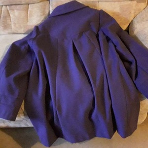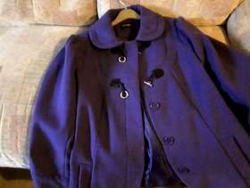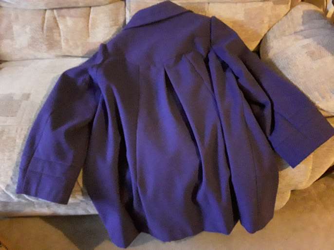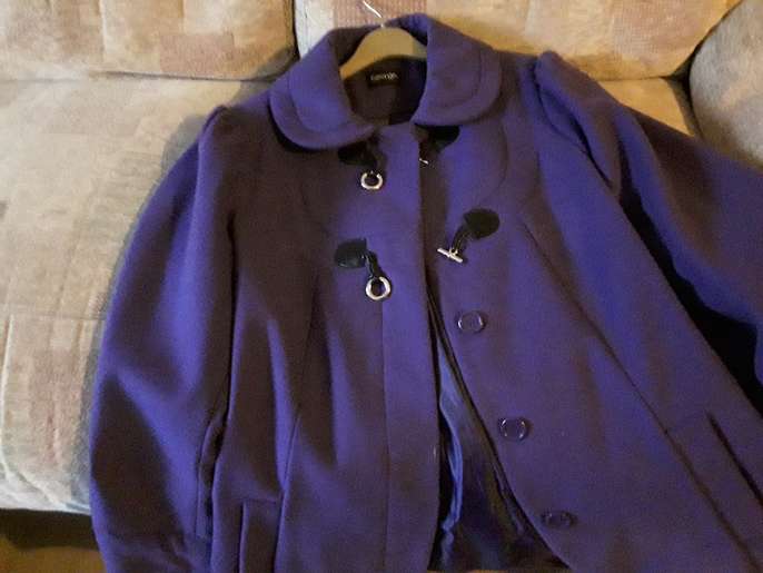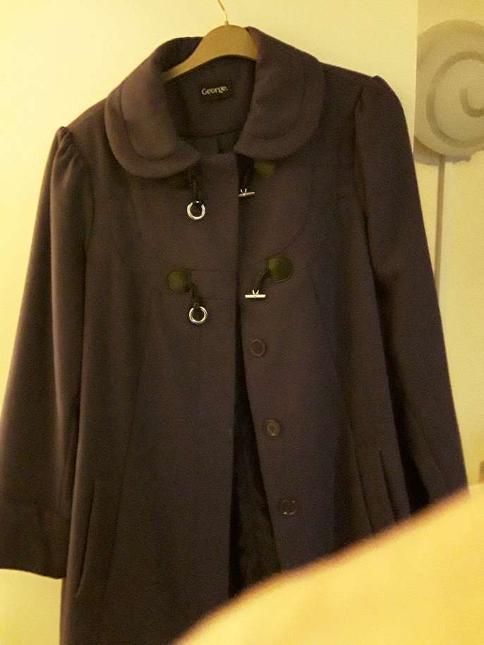 George size 22 purple Jacket ,nice button details ,quite warm ,in good condition. I love it but have found because I have Lymphedema in my arm and therefore swelling it just sit to tight on that arm .sorry the light is bad on photos where it is hung on door the correct colouri g is the two that it is on settee