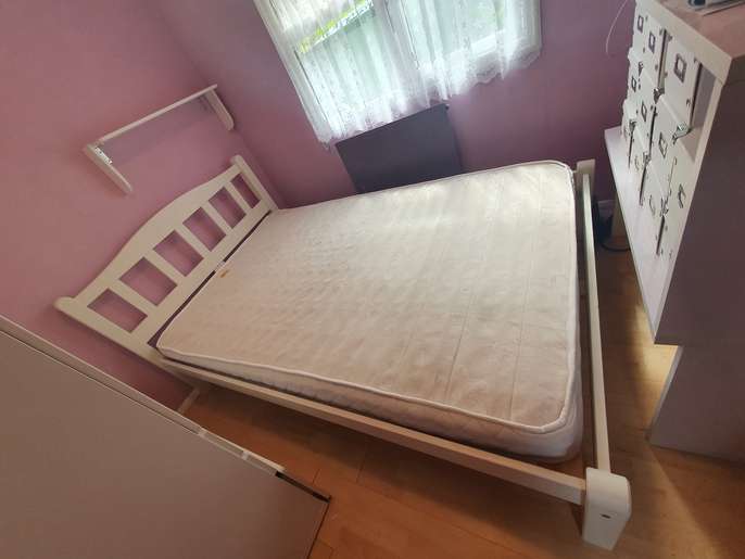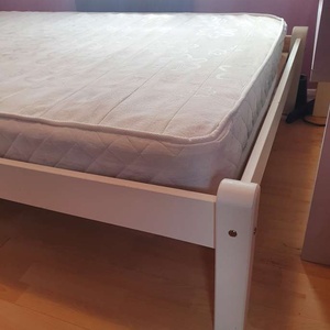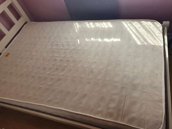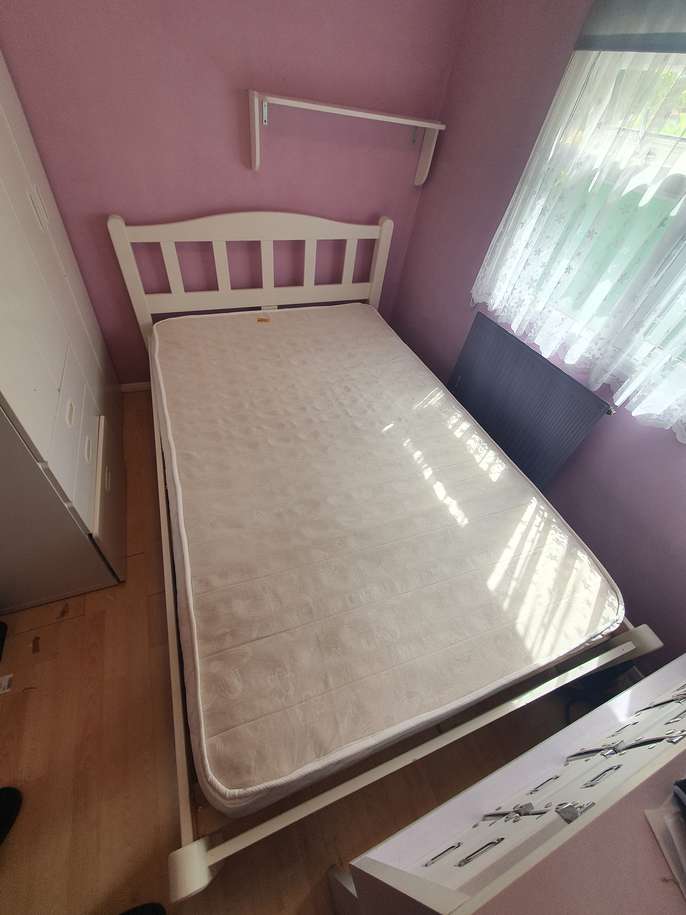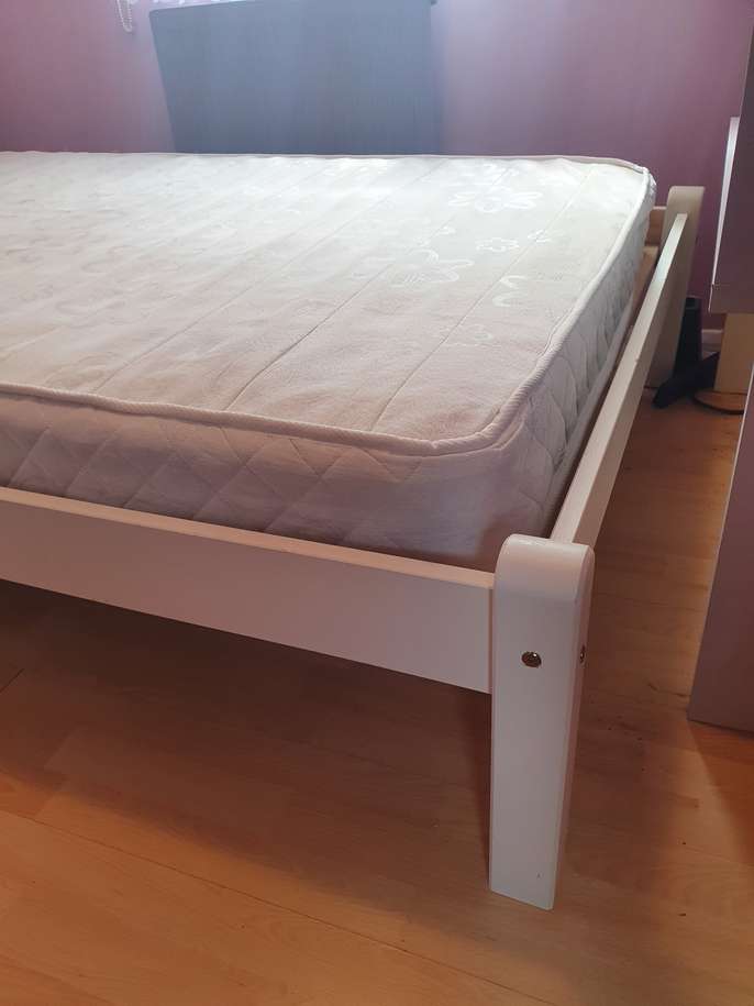 4ft wide small double bed with mattress. Condition is Used, all slats in good condition, used as a guest bed. White wooden frame, has been dismantled for storage and transport. Unbranded mattress is clean and unmarked, soft, very good condition. Collection only from Chertsey KT16, 10minutes from J11 M25.