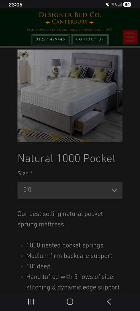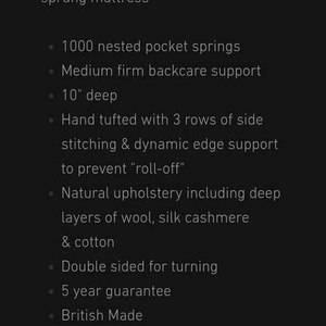 I have a 5" Signature Pocket 1000 mattress brand new and never used. It's still in its plastic wrapper. In the pictures is tells you all about the mattress. As well as in one of the other pictures it shows a black line about 15cm long down the side of the mattress. It's doesn't affect the mattress in any way. I contacted the company about it and they sent me out a new one and didn't bother taking this one away. As u can see it cost me £599 for it and im only looking for £100 for it.