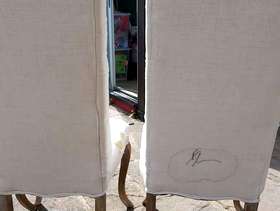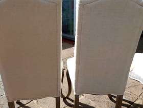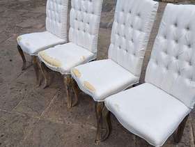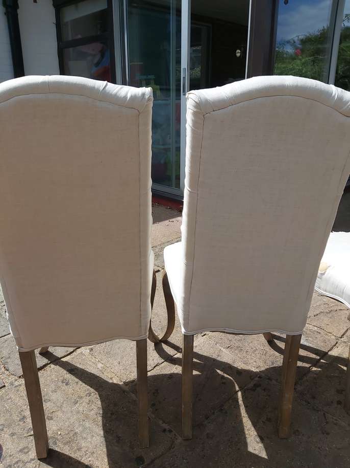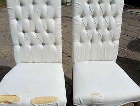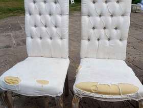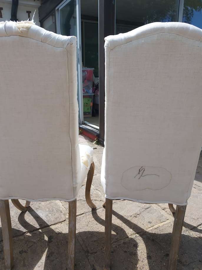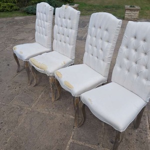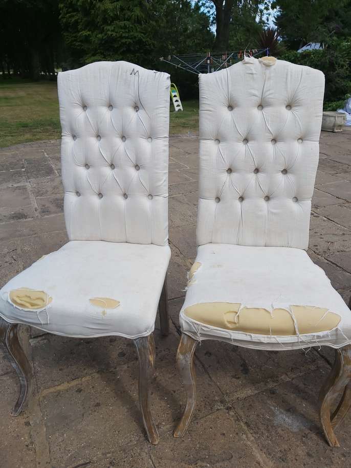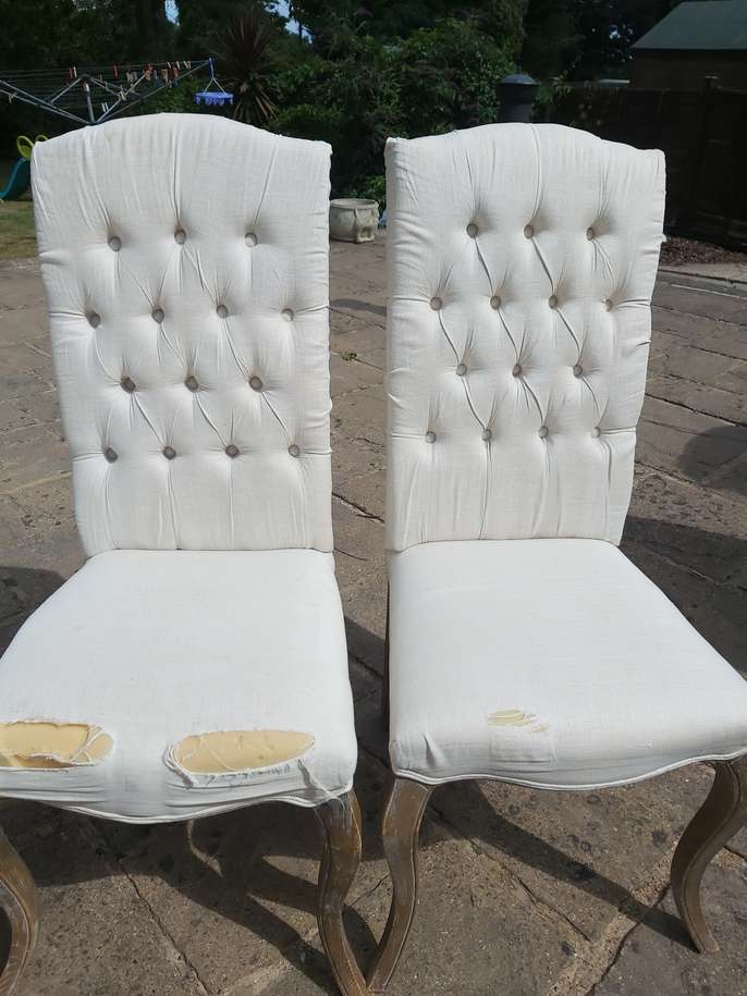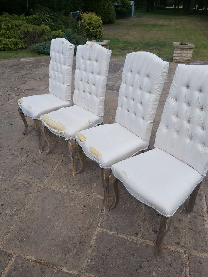 4 x lovely buttoned back dining chairs that need re-upholstering. Been well loved but quality chairs bought from France. Some need more foam putting back in and got marks/ pen over them. Grab a bargain as they were very expensive!