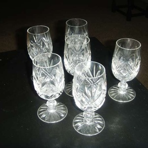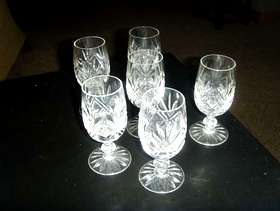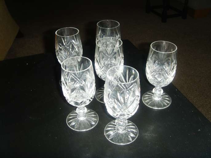 Set of 6 lovely cut crystal wine/sherry glasses, no chips or cracks MINT condition with a FREE almost unused shower head...6 inches diameter so just like on TV...in a waterfall! (depends which TV shows you follow)