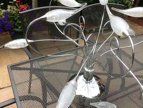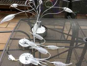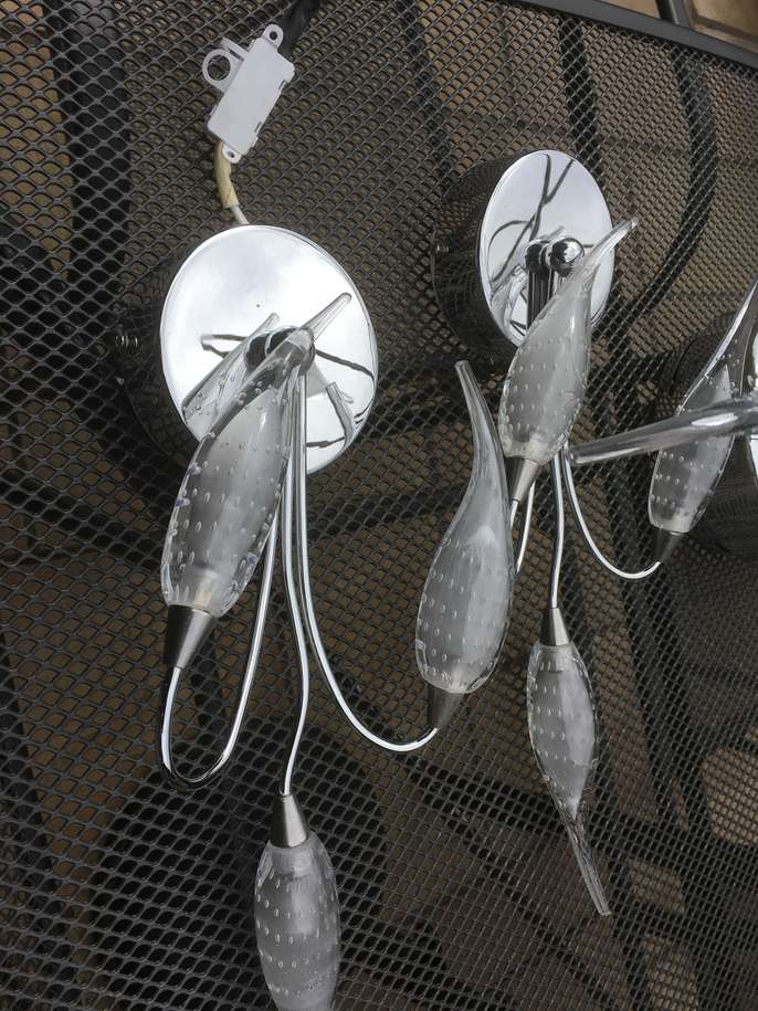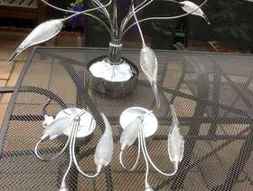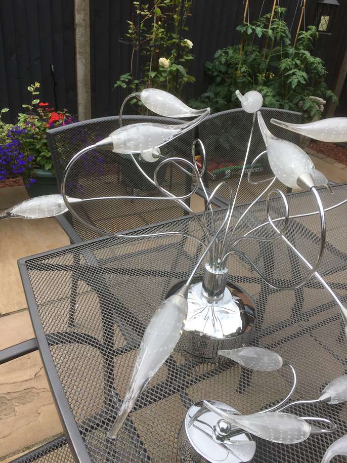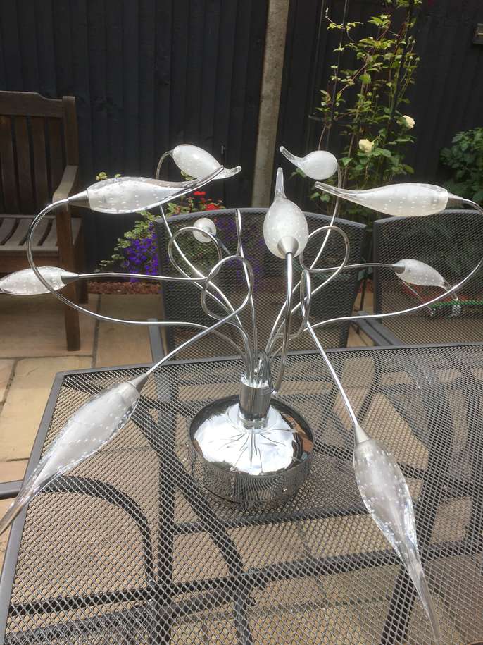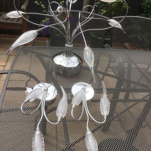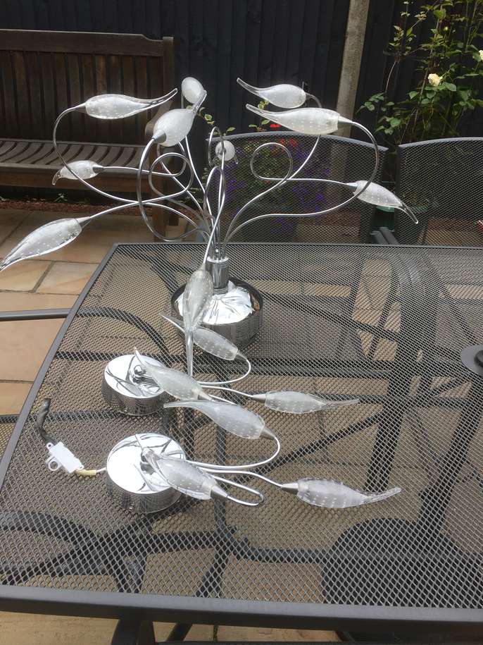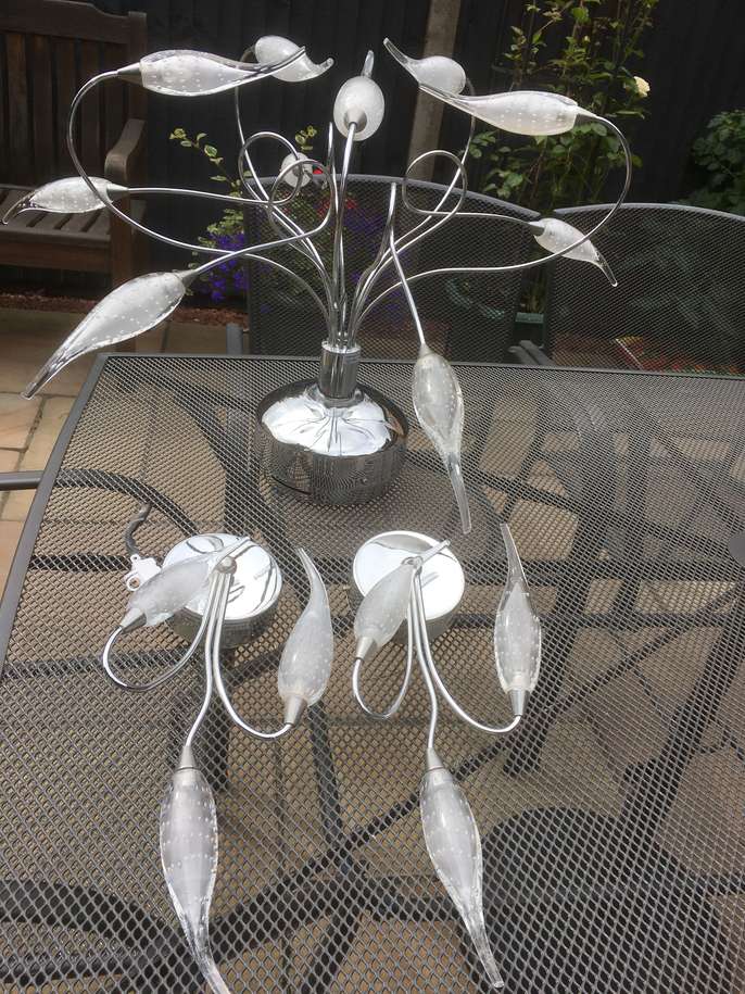 8 Globe hanging ceiling light with 2 matching wall lights. The base is silver metal colour, the glass shades are speckled. Plenty of life left in these lights. Collection from Camberley or Warfield.