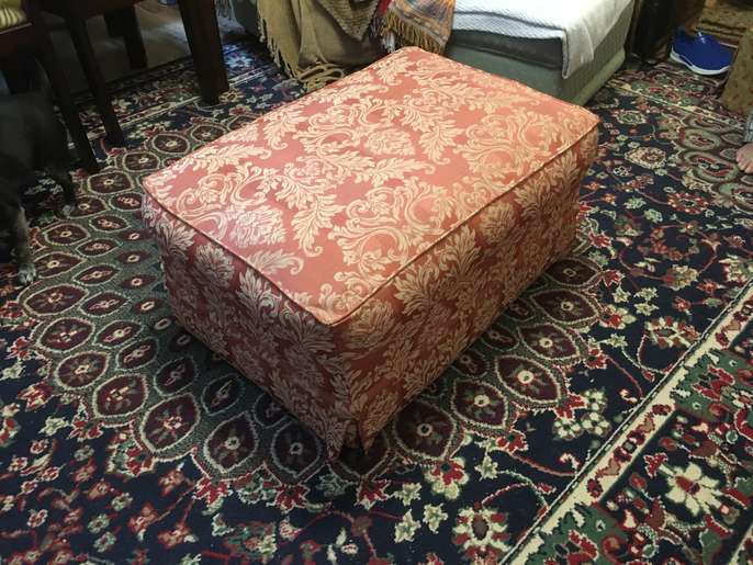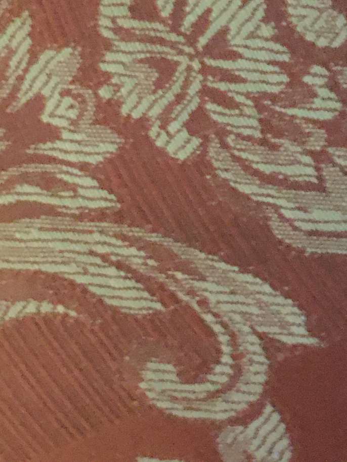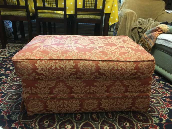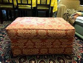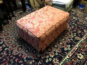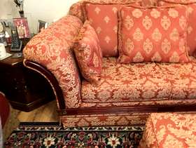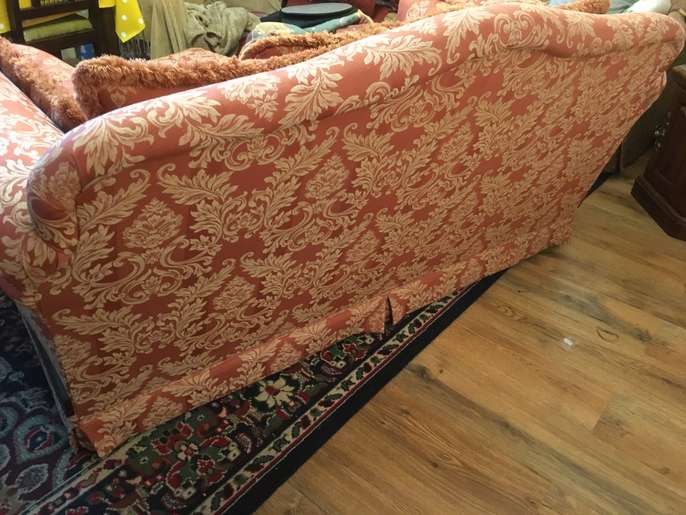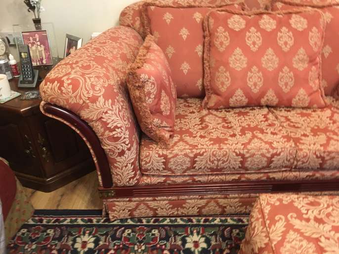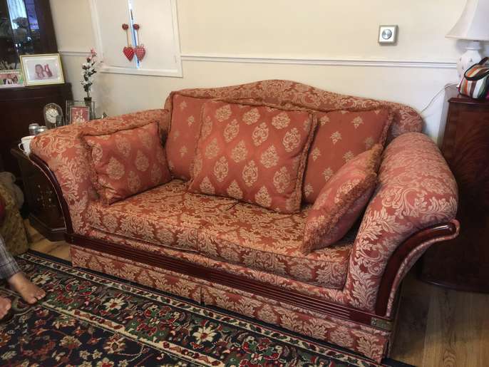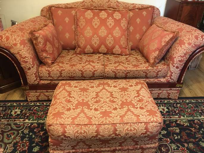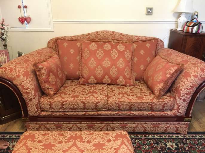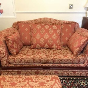 A lovely Red with a Cream leaf design Sofa with Footstool to grace any room. The Sofa is so comfortable that you just want to curl up in it. The cushions are big and cuddly yet full and stand proud on the base. The material is a leafy design of a good quality material. ( See Picture). Three large cushions for your back and two smaller ones for the sides in a contrast Design. The wood trim outlines the curved sides and then runs across the bottom with two brass plates on the sides as shown in the picture. There are no tears or stains to sofa or cushions which are removable for cleaning. The Footstool is of the same material and colour and in good condition. It is on wheels and can be used as a comfortable extra seat. Width 6’6” Floor to top of arm 1’5”. Floor to top of cushion Collection from Datchet in person.