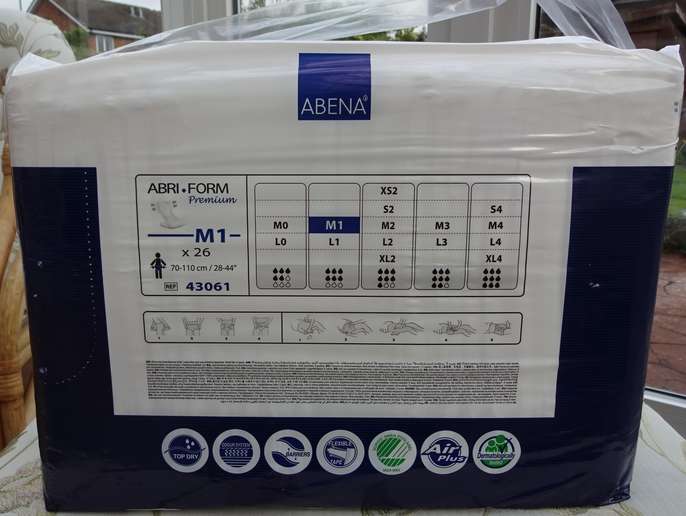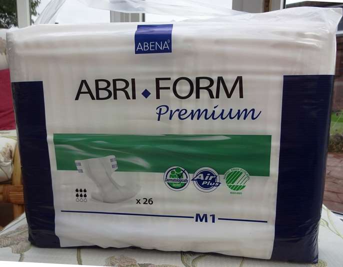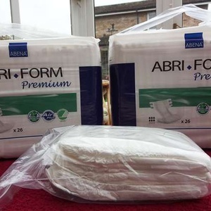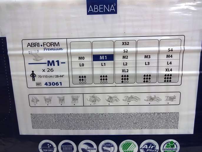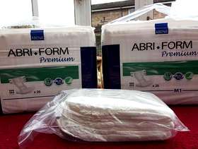 Abri-Form Premium M1 - Medium - 2 x Packs of 26 - 2000ml - 53 Adult Nappies Please note: One pack is unopened. The other pack has been opened & 2 have been taken out - but included are 3 EXTRA ones, so there are actually 53 in total Features and Benefits Full breathability Soft, comfortable and noiseless Optimal leakage protection provided by soft and reliable leakage barriers extended right to the edge and built-in cross barriers at the rear Unique Top Dry system providing a dry surface and rapid absorption Excellent absorption Flexible tape equipped with adhesive and hooks to allow for repositioning Wetness indicator with graduation scale – for a better indication of capacity use Latex-free and non-chlorine bleached Nordic Eco-Label Dermatologically tested