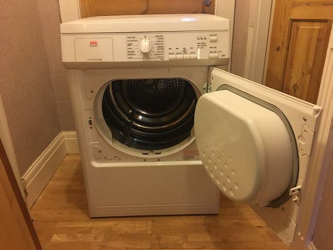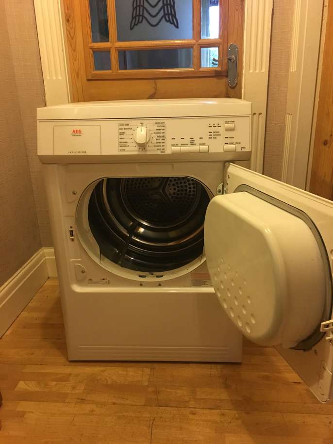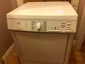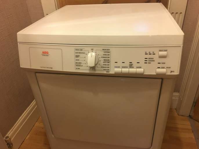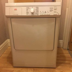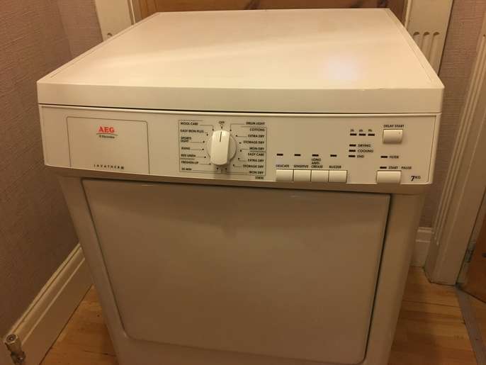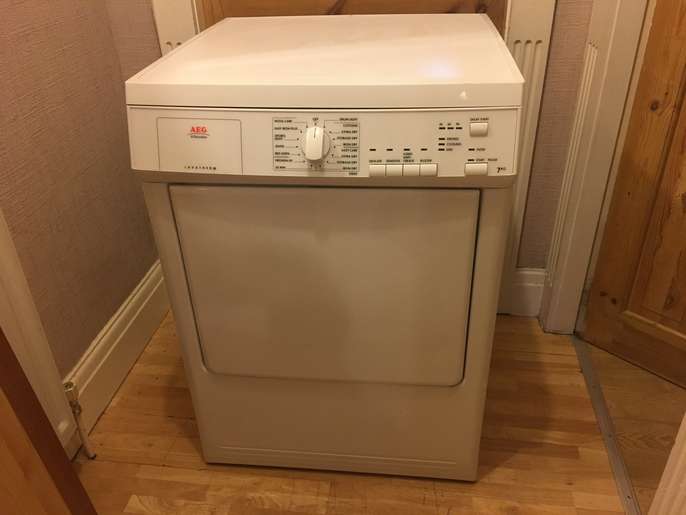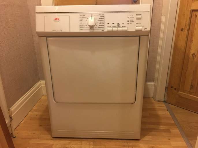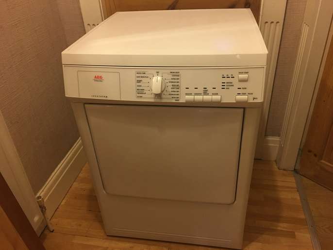 This good quality well made aeg vented tumble dryer has a 7 kg drying capacity it stands 85 cm tall and is 60 cm wide by 58 cm deep it has a variety of programmes including wool care sports lights jeans bed linnen freshen up and a 30 minute setting all you need is a venting hose i can deliver to the local halifax/bradford area for a £10 delivery charge