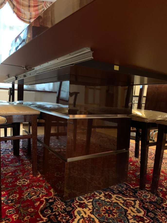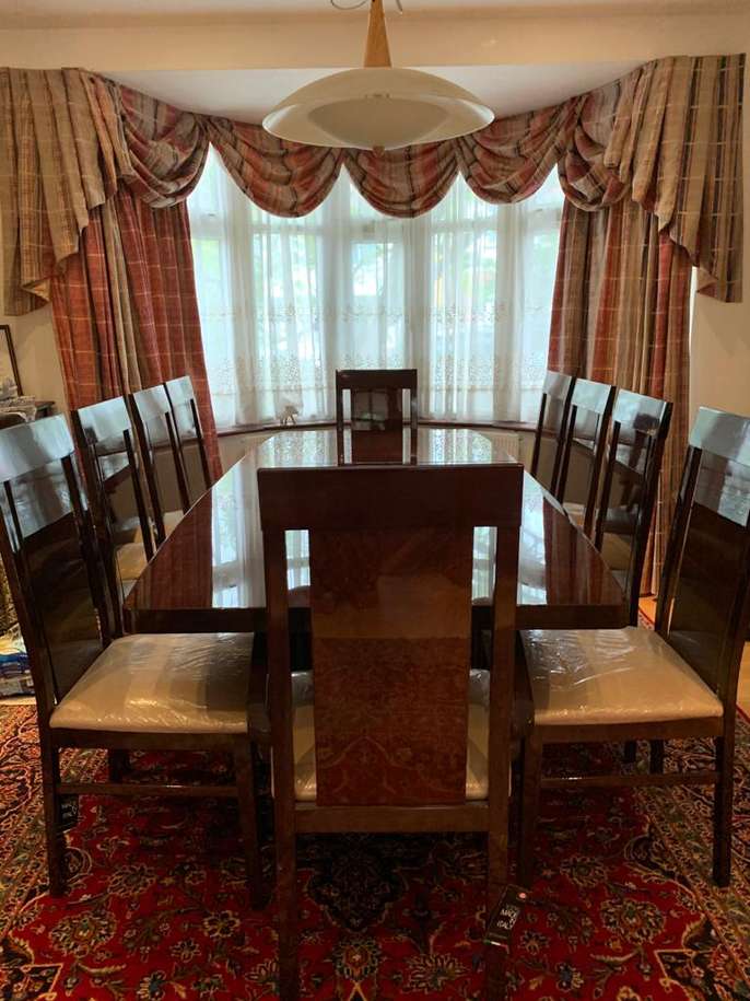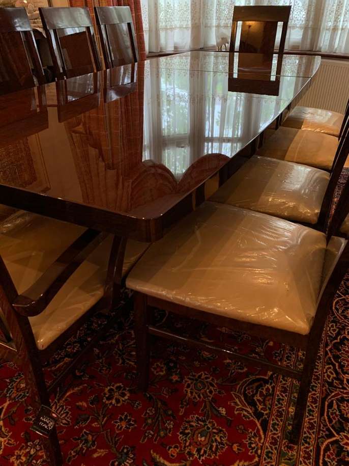 Alf Rossini designer extending dining table with 10 chairs, most cushioning and is still in plastic covering and brand new. Bought from furniture village which currently stocks the table with 4 cheaper chairs for 3.5k (currently on sale for £2395). Table and chairs in excellent condition. Dining table and 10 chairs for £1200.