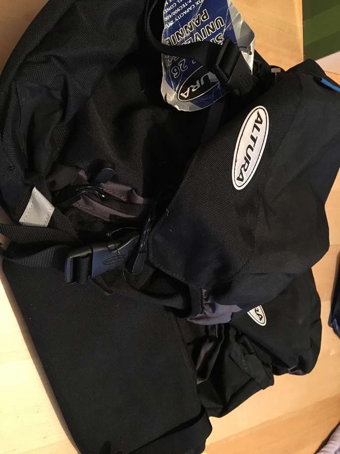 One pair of New Black Altura 26Litres universal cycle panniers - never used still with the labels on. Panel construction, quick release mounting system, integral rain cover, reflective trim, mounting clips attached. Perfect pressie for the cyclist.