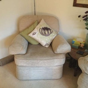 Marks and Spencer cream coloured armchair. Chenille fabric with arm covers