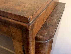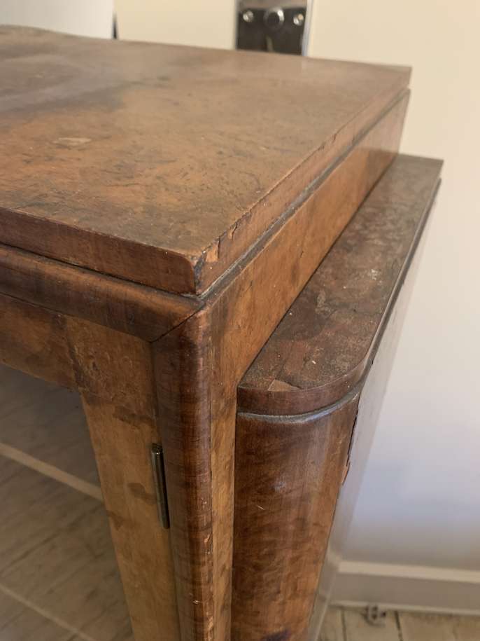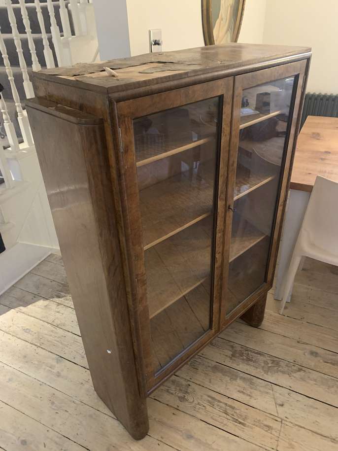 This is a genuine art deco period piece - walnut veneer, glass fronted cocktail cabinet with 3 interior shelves & lighting fixtures. Measures in cm: W92 H136 D 34 . Lockable (comes w original key) Top is water damaged (see photo), but otherwise in good nick. Reluctant sale due to space management. For collection only (its quite heavy - will assist load)