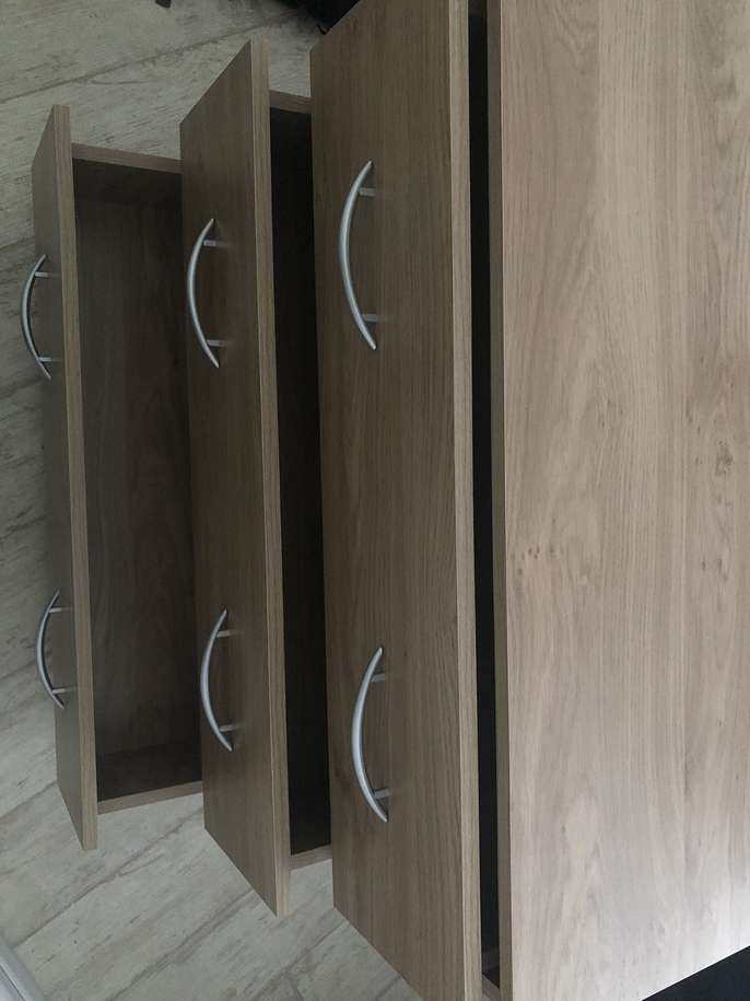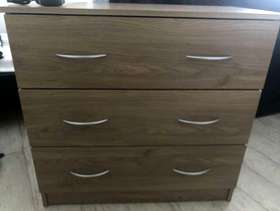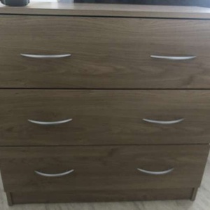 3 drawer chest of drawers. Oak finish. As new only been using for about 2 weeks. It does have a chip on the side from when I built it please see photos. Height 76cm 30inches Width 80cm 31.5inches Depth 39cm 15.5 inches