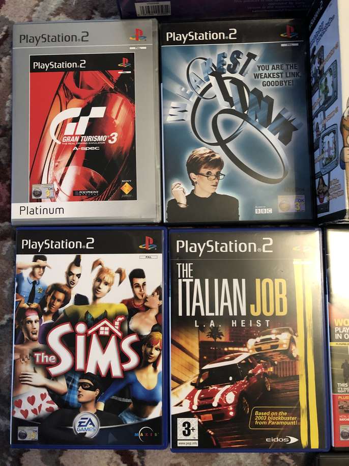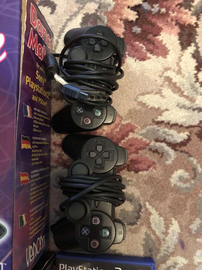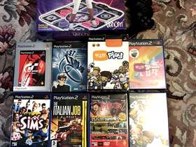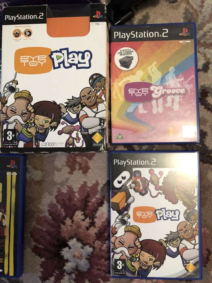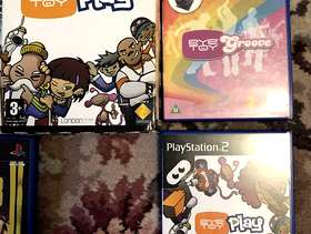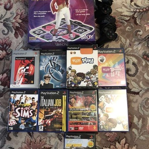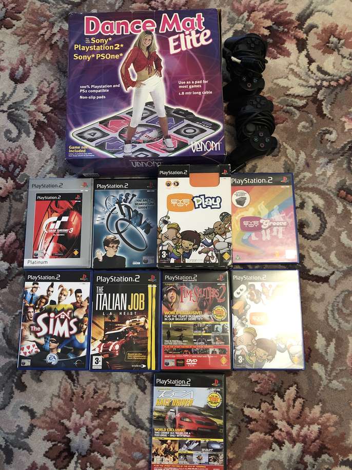 Two PS2 controllers, one dance mat suitable also for PS/1, EyeToy Play with two games and four other games and two sample discs.