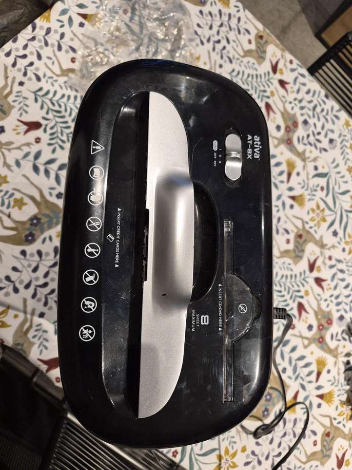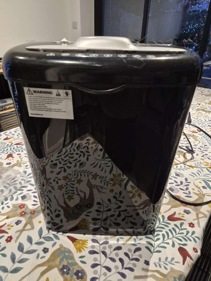 Excellent condition. Used in office - no longer needed. A a compact cross-cut shredder designed for home or small office use, featuring a P-3 security rating for sensitive documents. It shreds paper, staples, credit cards, and CDs, and includes a pull-out bin and overload protection. Key Features and Specifications Security Level: P-3 cross-cut (4.8mm x 55mm shreds). Capacity: 12 sheets (70gsm) per pass. Bin Size: 17 litres. Collect from KT3