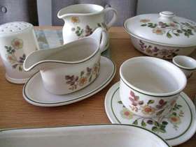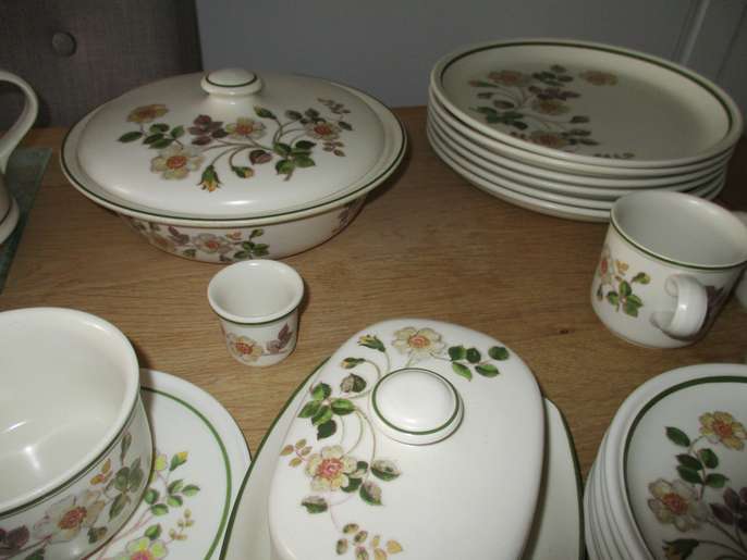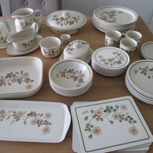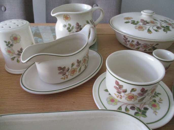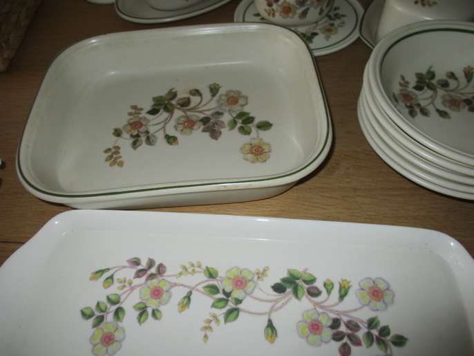 6 place mats, 6 med plates, 6 large plates, 6 small plates, 5 bowls, 3 cups and saucers, butterdish, sugar bowl, jug, gravy boat, small tray, flour shaker, casserole dish with lid, square dish.
