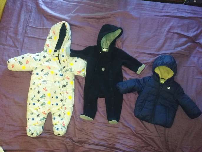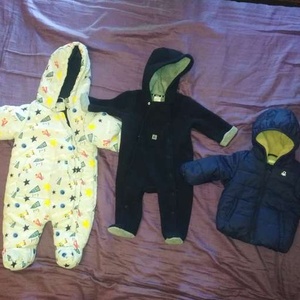 Grey/colourfull winter suit for baby, size 74 , perfect condition- 5£ dark blue autumn/winter short baby jacket, size 68, perfect condition- 4£ dark blue, polar autumn suit for baby, size 74, perfect condition- 3£ I can sell all of them for 10£ Im open for offers.