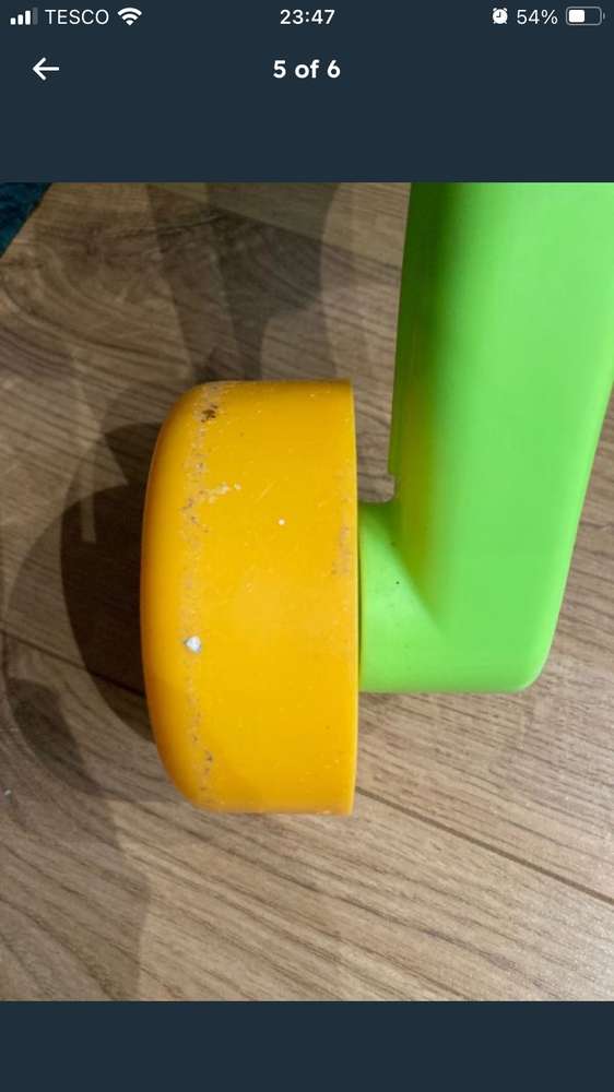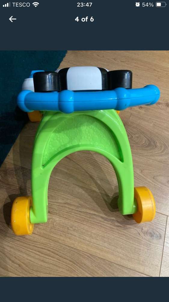 Baby walker Used baby walker. Book on the walker is ripped and wheels bit worn but otherwise good.