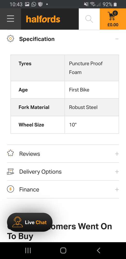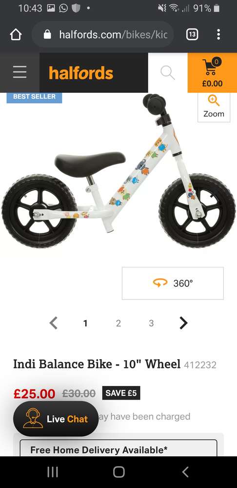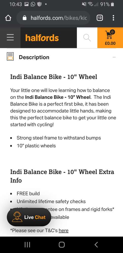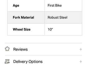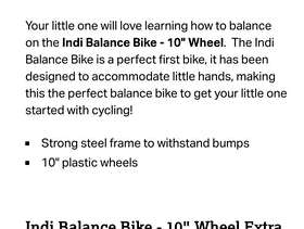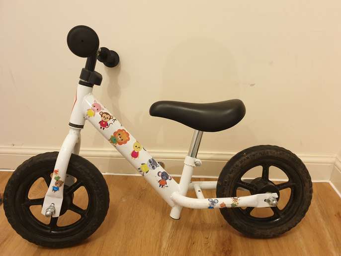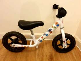 Halfords balance bike 10 inch wheels. Item is used but in excellent condition, we have simply.outgrown it. The seat can be altered to grow with the child, my photos show the seat at max height. This item is still in halfords for sale 2 years after we bought ours so it is very popular! I will try to add screen shots of the specifics from halfords with my photo of our bike. Collection only, pet free and smoke free home.