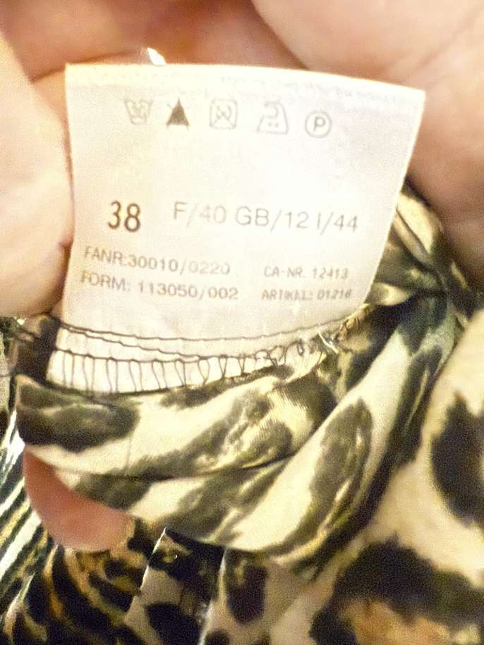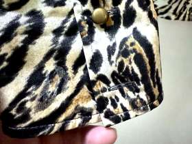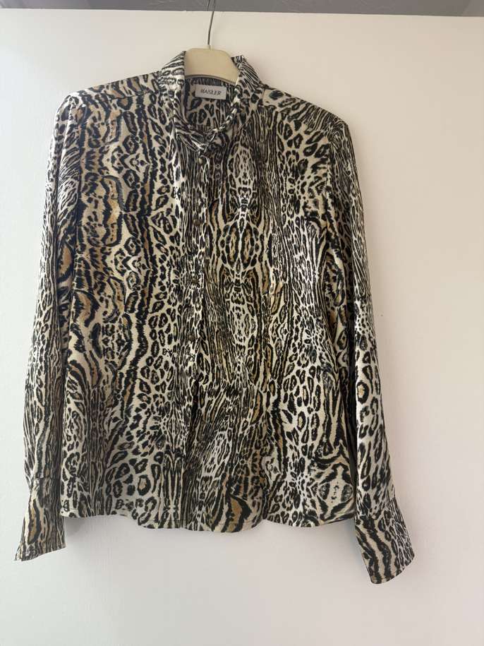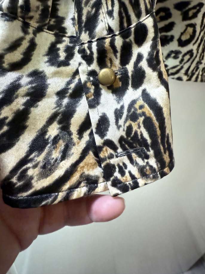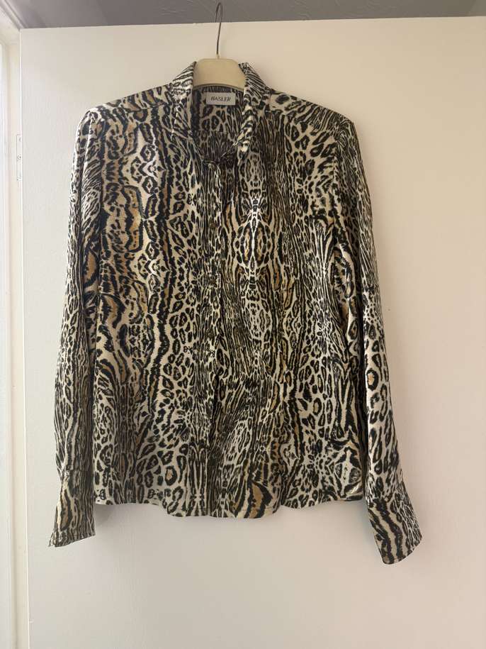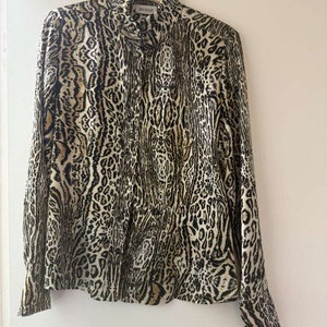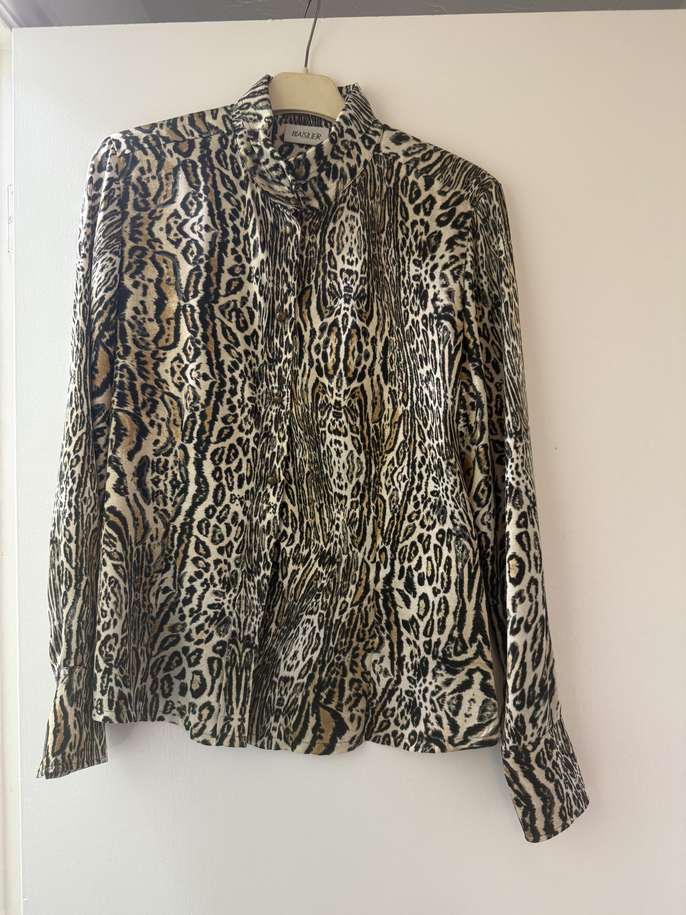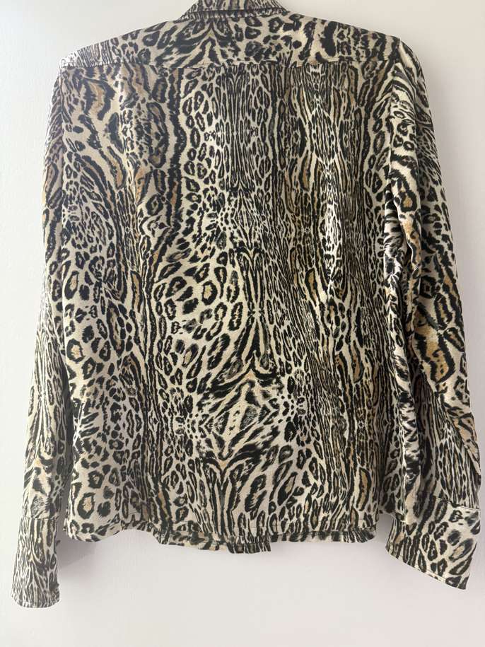 Animal print polyester blouse by Basla feels like satin I think it’s from the 80’s very good condition except for 2 missing buttons one at the bottom of blouse and one on the cuff