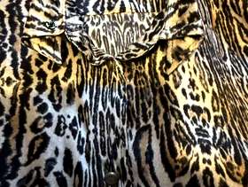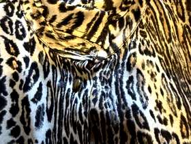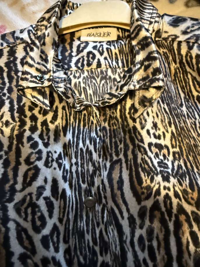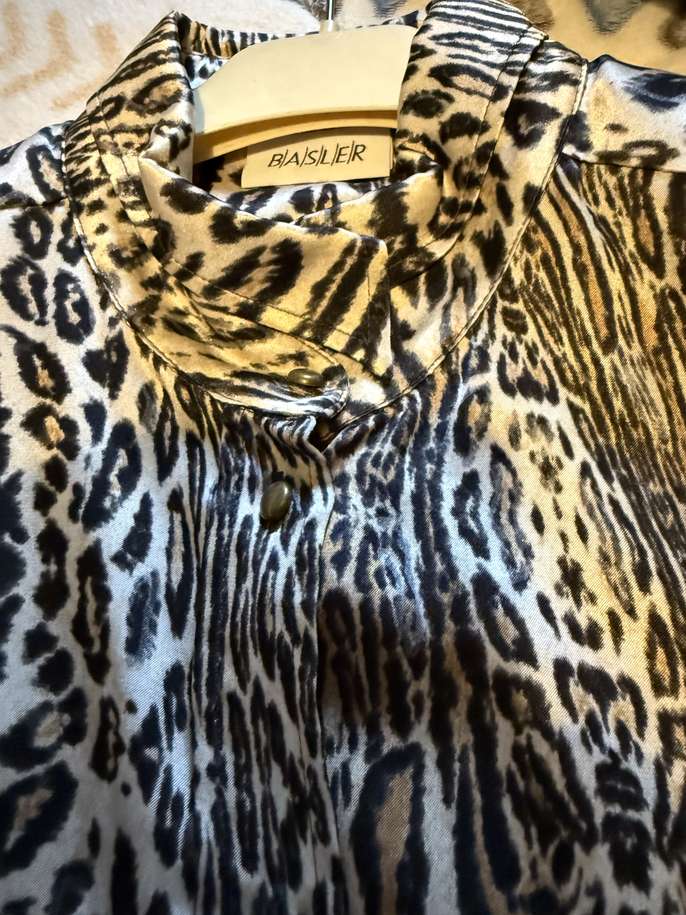 Animal print polyester blouse by Basla feels like satin I think it’s from the 80’s very good condition except for 2 missing buttons one at the bottom of blouse and one on the cuff, the collar can be worn 2 ways open or done up as in the images