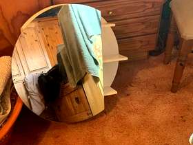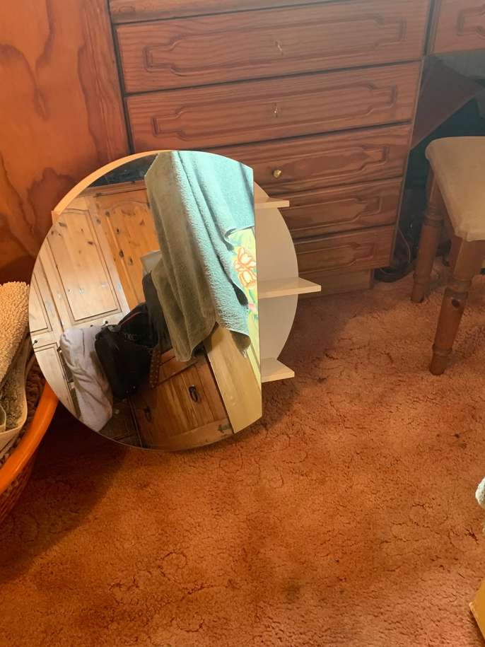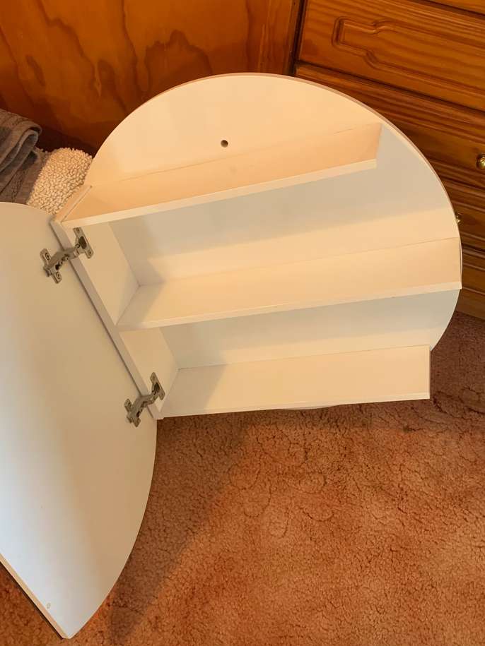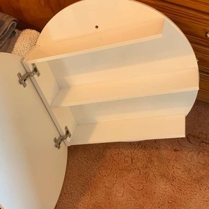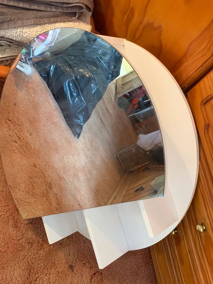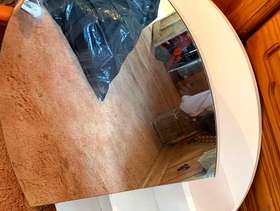 Very unusual large bathroom cabinet with semi round mirror. 3 storage shelves. White Excellent condition when bought was £150. size 24.5 inches x 23 inches. Buyer collects. Cash only . Bargain at £27 Quick sale required