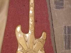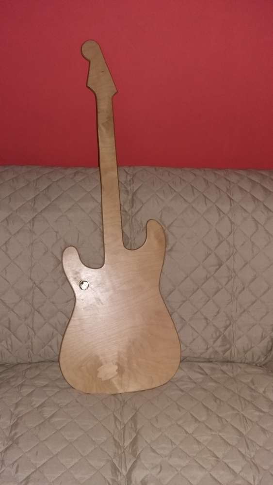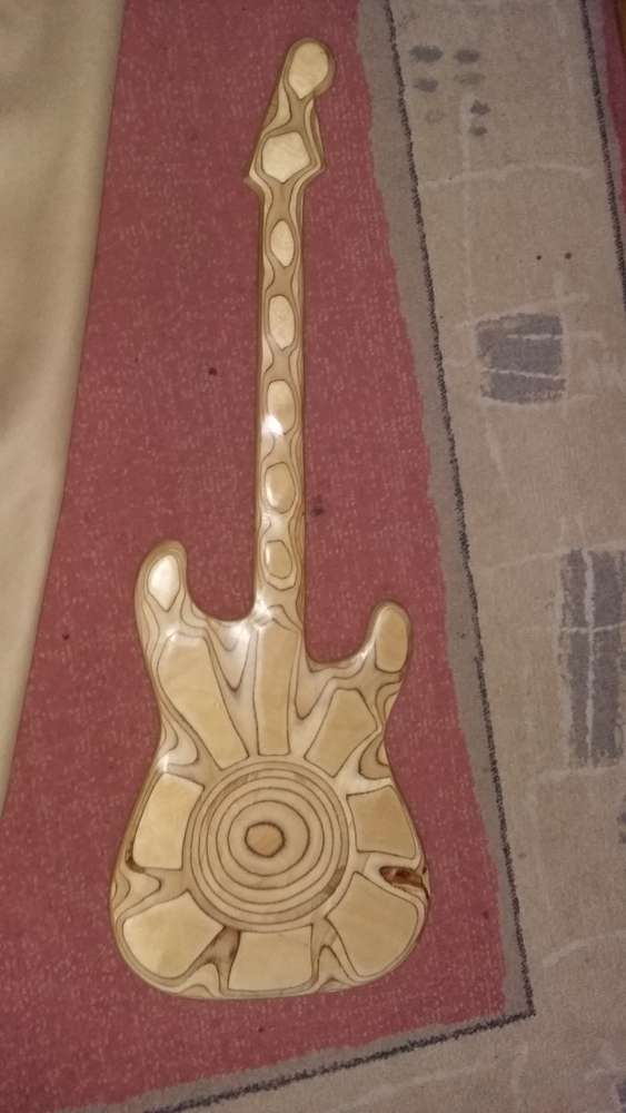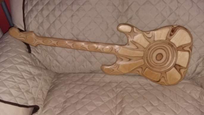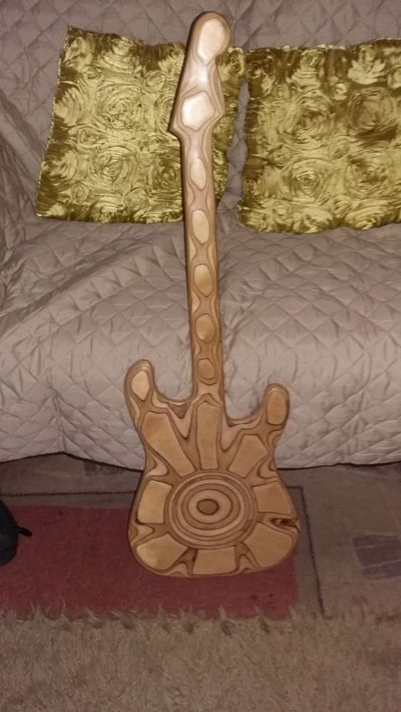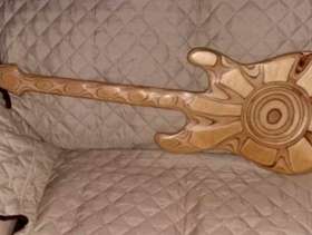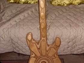 Handmade wooden guitar beautifully decorated and smooth to the touch. Can be displayed on the wall with hook at the back most certainly be a topic of conversation.