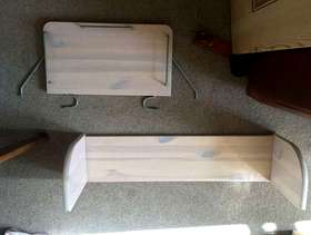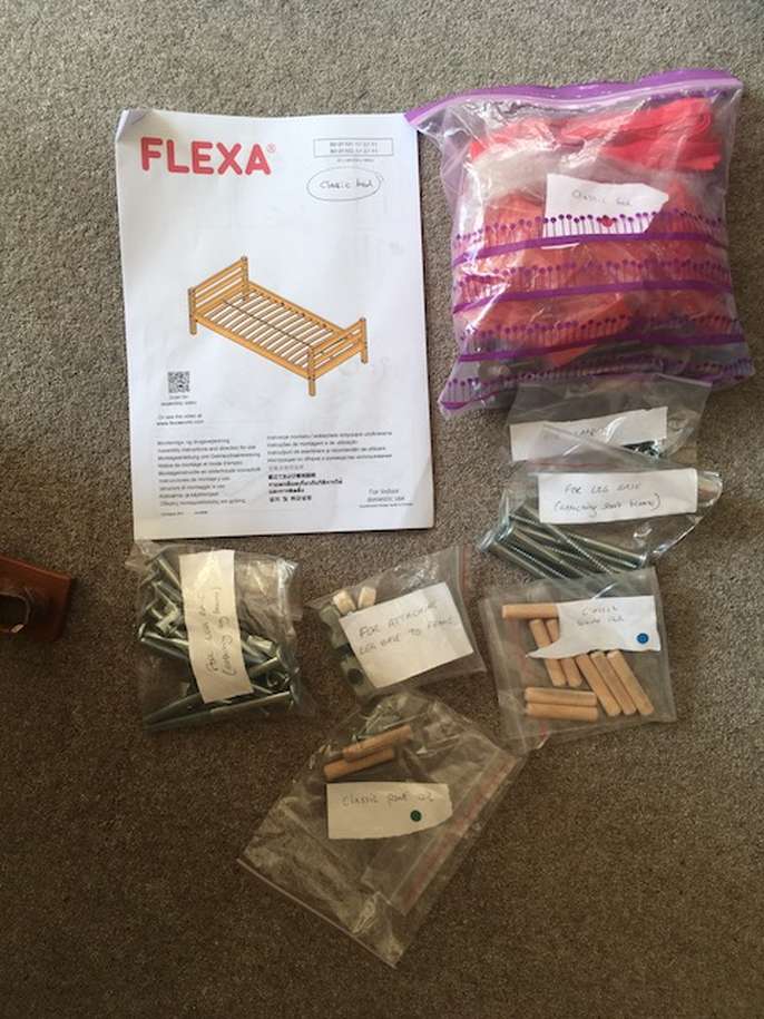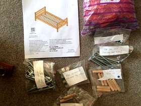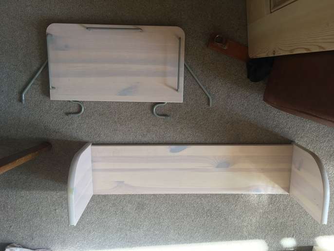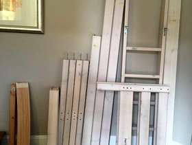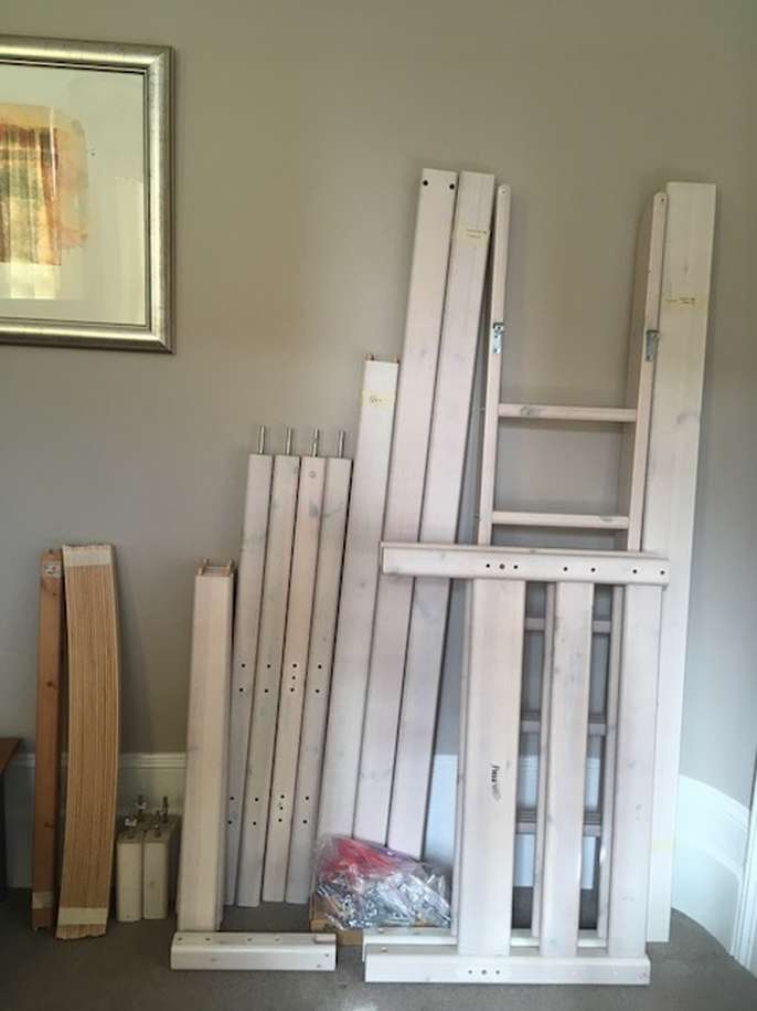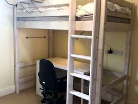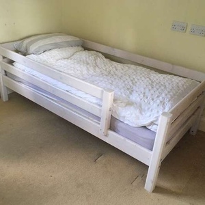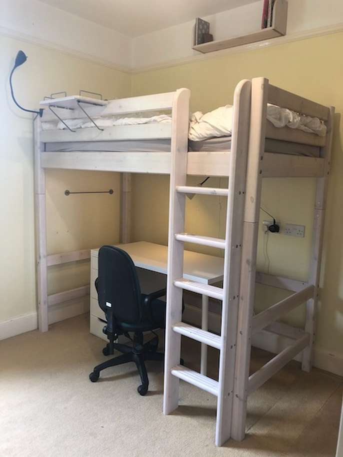 Second hand high bed, in good condition. Ideal for children and teenagers, this full-sized bed (200x100cm) takes a standard UK single mattress (190x90cm). It is very sturdy and made of solid wood (pine), finished with a white-washed pine coating. It is part of the modular Flexa classic bed range so can easily incorporate additional furniture kits, such as a lower bunk bed and integrated desk systems and storage units. This bed is supplied with 2 choices of leg extenders so that the bed can be configured at three heights: Standard single bed (frame = 67cm high, height to top of mattress ~50cm) Mid-sleeper Bed (frame = 88cm high, height to top of mattress ~ 71cm) High-sleeper bed (frame = 185cm high, height to top of mattress ~ 164cm) The standard single bed configuration is suitable for adults. The mid-sleeper configuration provides plenty of under-bed storage space, while the high-sleeper configuration allows for a desk and other furniture to be placed under the bed space. Also supplied are: - a full height, vertical ladder - front and back rails (detachable) - small wall-mounted book shelf - small bed-mounted tray - printed assembly instructions (assembly instructions are also available online at the Flexa website here: https://www.flexaworld.com/en/product/90-10070-2-01/high-bed-with-straight-ladder ) The bed has been partially dismantled for ease of transport. I am happy to answer questions on this item and provide more information.