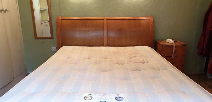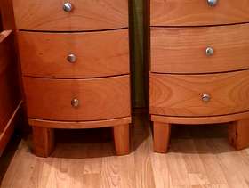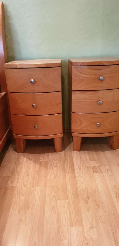 King size pine sleigh bed frame with 4 storage drawers. Complete with 2 matching bedside cabinets. Very good condition, very solid. Reluctant sale due to bedroom refurb.