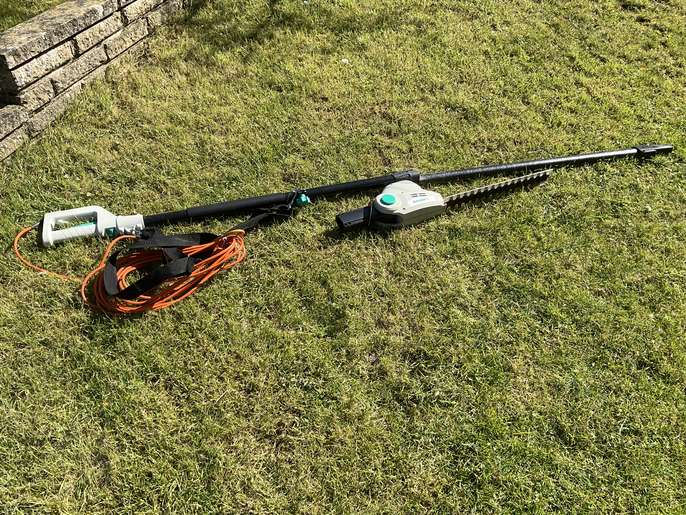Bergman telescopic hedge and brush cutter, little used, working order. Runs on corded mains power. Total unit length is 3 metres, box specifies it will cut things up to 16 mm thick.