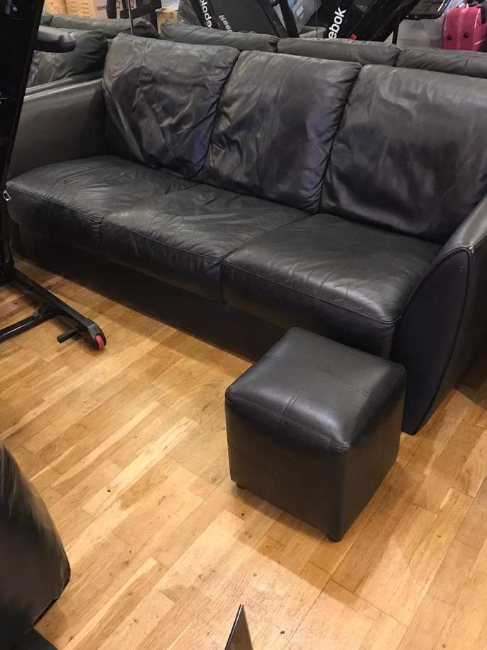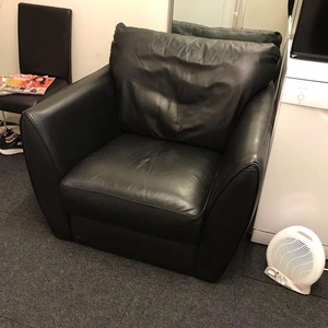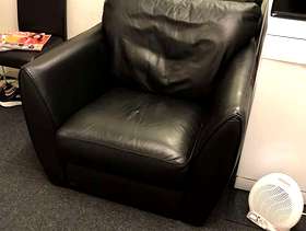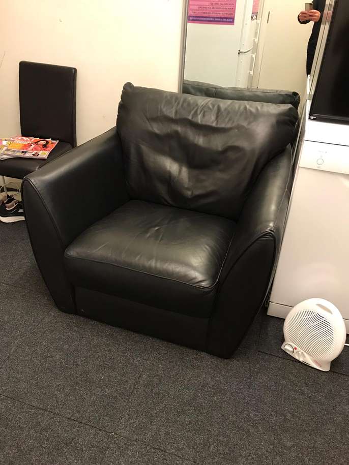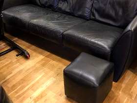 Three seater leather sofa and pouffe and matching armchair. Very good condition and very comfy. Will sell separately if required. £70 for the sofa and £25 for the chair