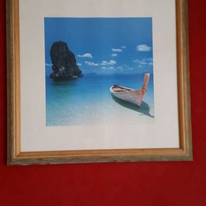 Lovely picture of a boat on the shore in a pretty blue/brown frame. Buyer collects.