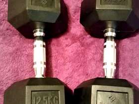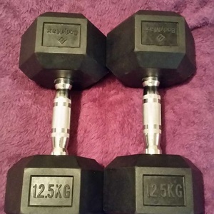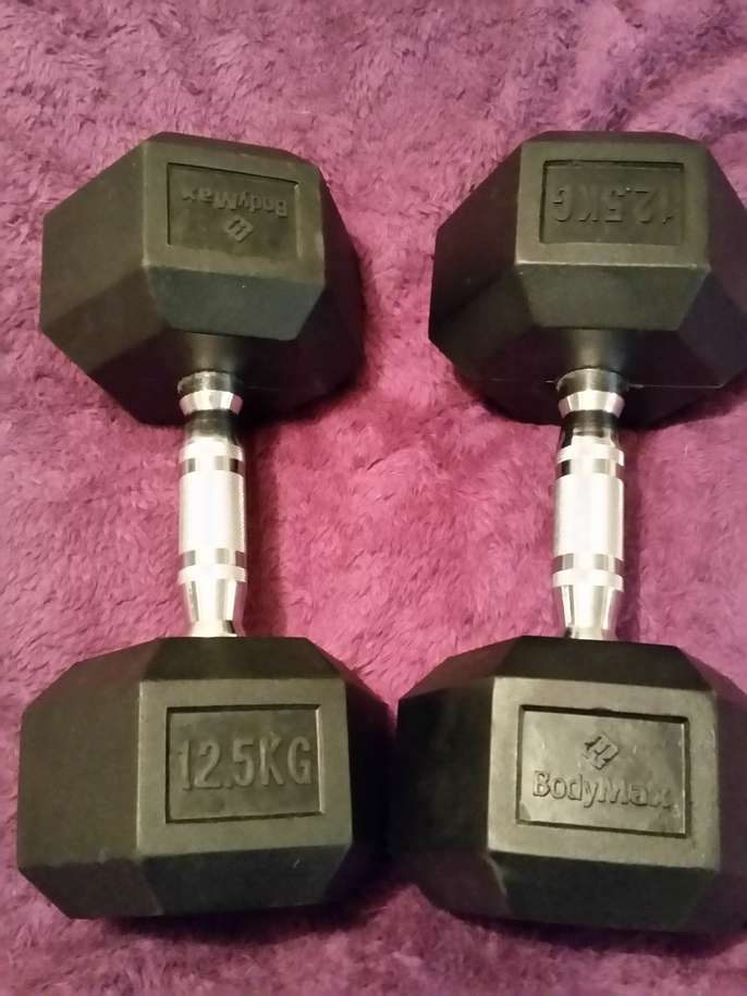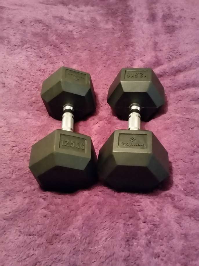 Pair of 12.5g Body Max Hexagonal Dumbells. Key features: Rubber coated ends for durability and protection Ergonomically contoured chromed and knurled dumbbell grip Hexagonal design prevents dumbbell from rolling