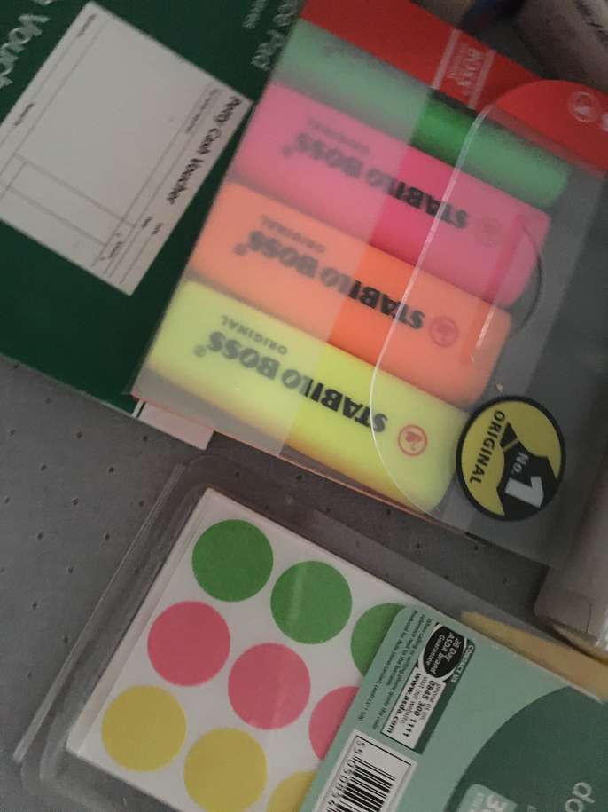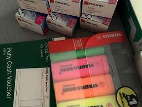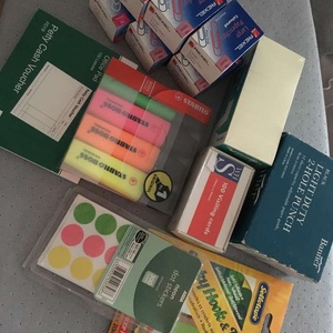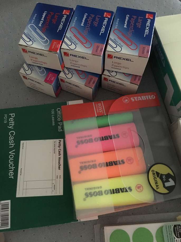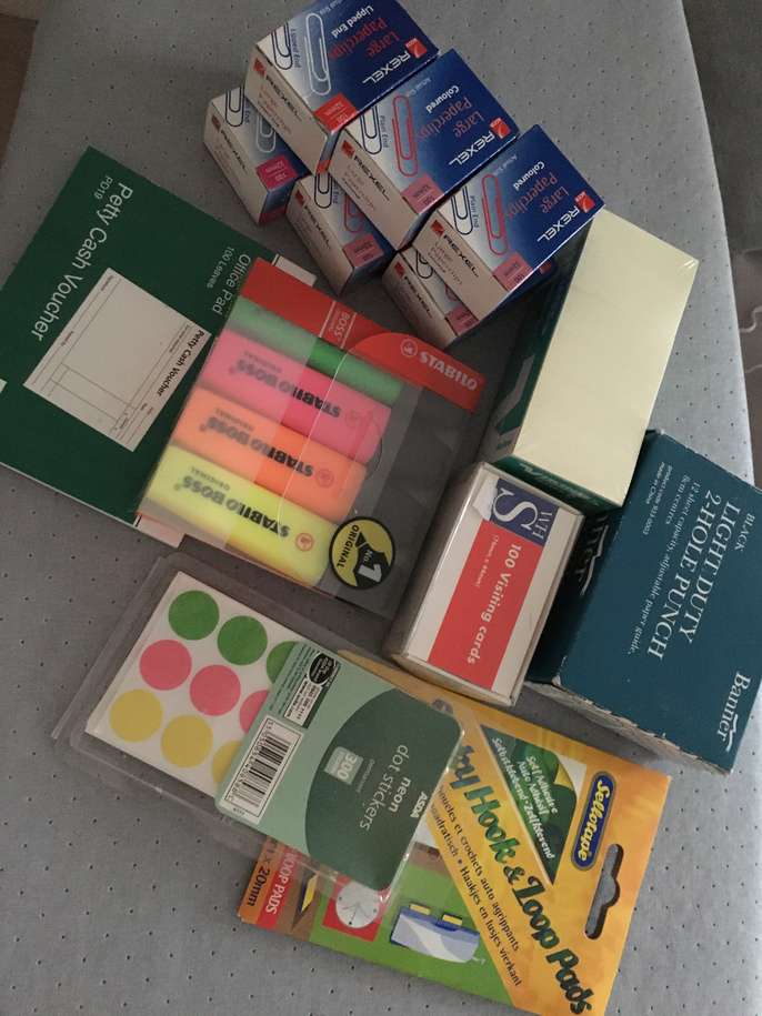Selection of brand new stationery items Consisting: Paper Clips (6 Boxes of coloured clips) Marker Pens Hole Punch Blank Cards Sticky Hook & loop Pads (for some reason there is one missing) Neon Dot Stickers Petty Cash Voucher Pad