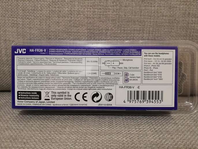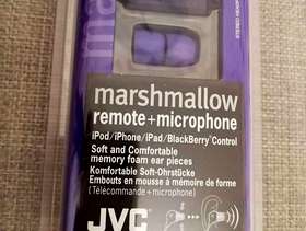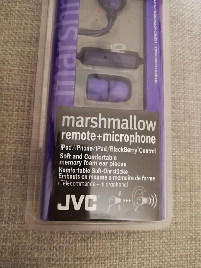 Pair of brand new purple JVC Marshmallow Earphones with remote (for play/pause/skip/call pick up functions) and microphone. See photos for details. Includes 2 sizes memory foam ear pieces. Cord length 1.2m.
