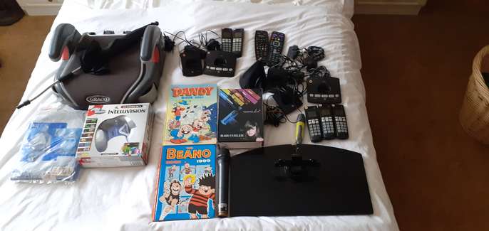 Light weight pushchair/car seat booster/tv stand/bt cordless phone/intellivision game/2 x books beano and dandy.set of denby cups/saucers