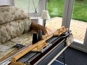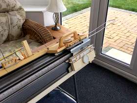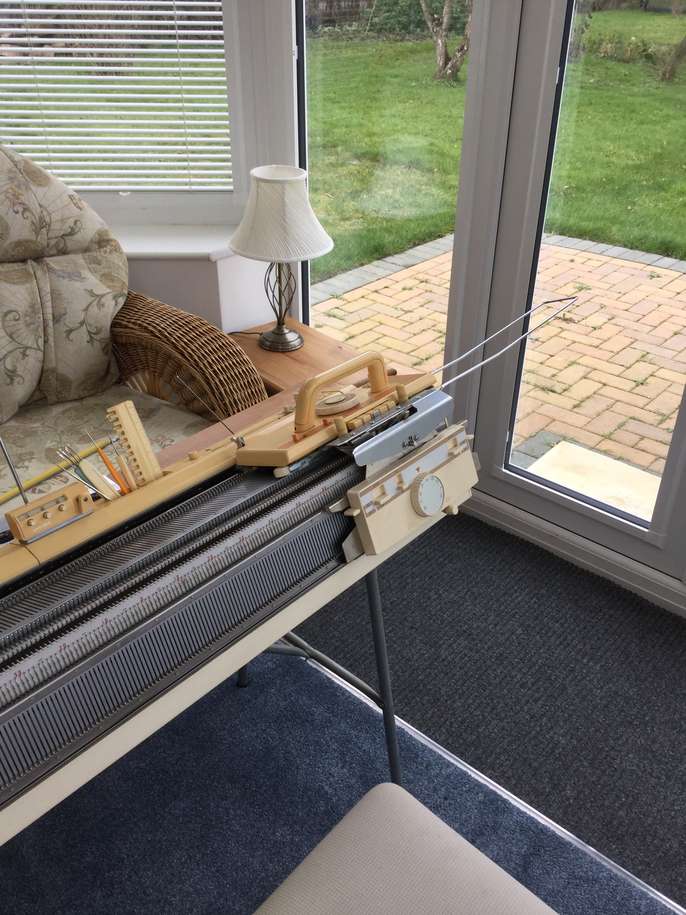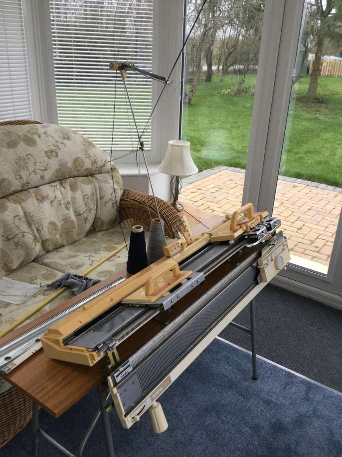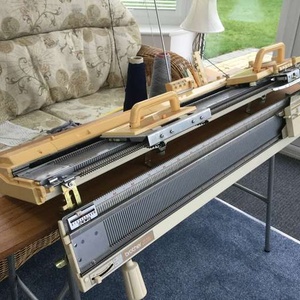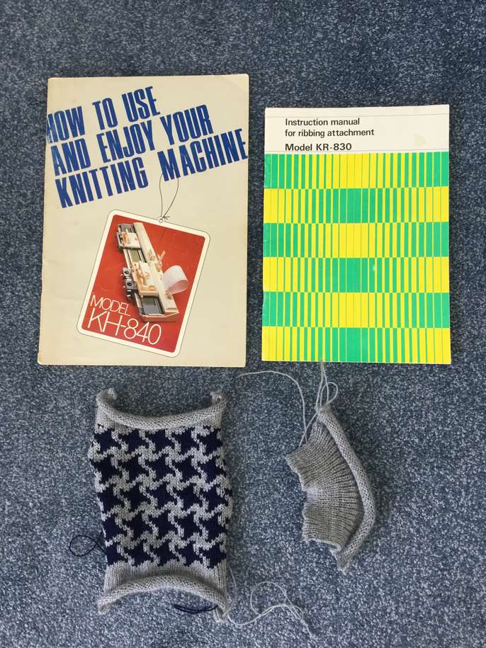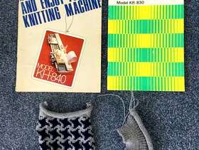 This is a Brother KH840 machine with a KR830 Ribber. It does NOT include the table. There are instruction books, a lace carriage, weights and tools. The sponge bar has a new sponge and the machine has been cleaned. I’ll also include a cone of yarn. The pieces of knitting shown were made on this machine.