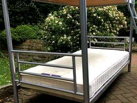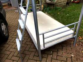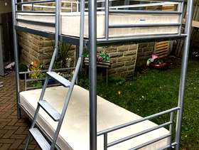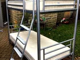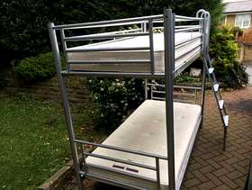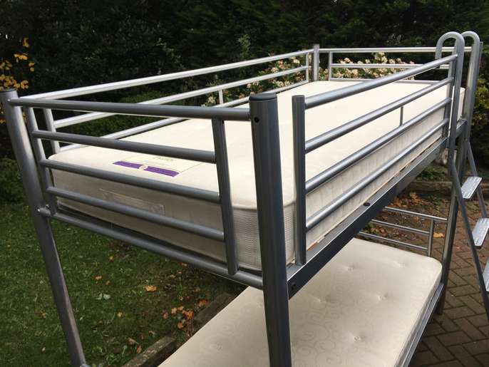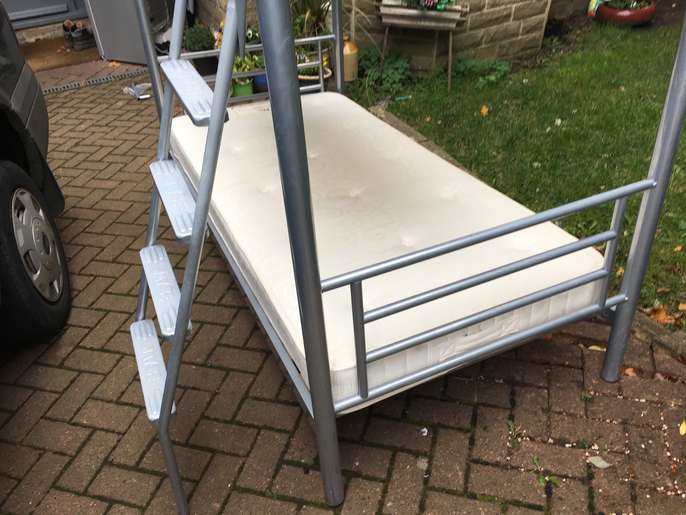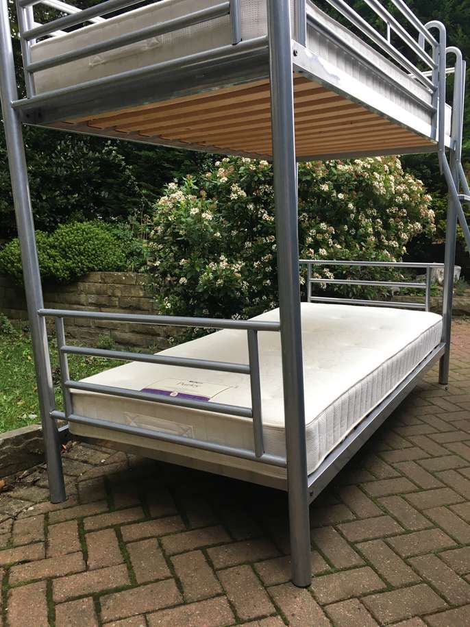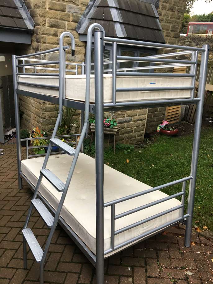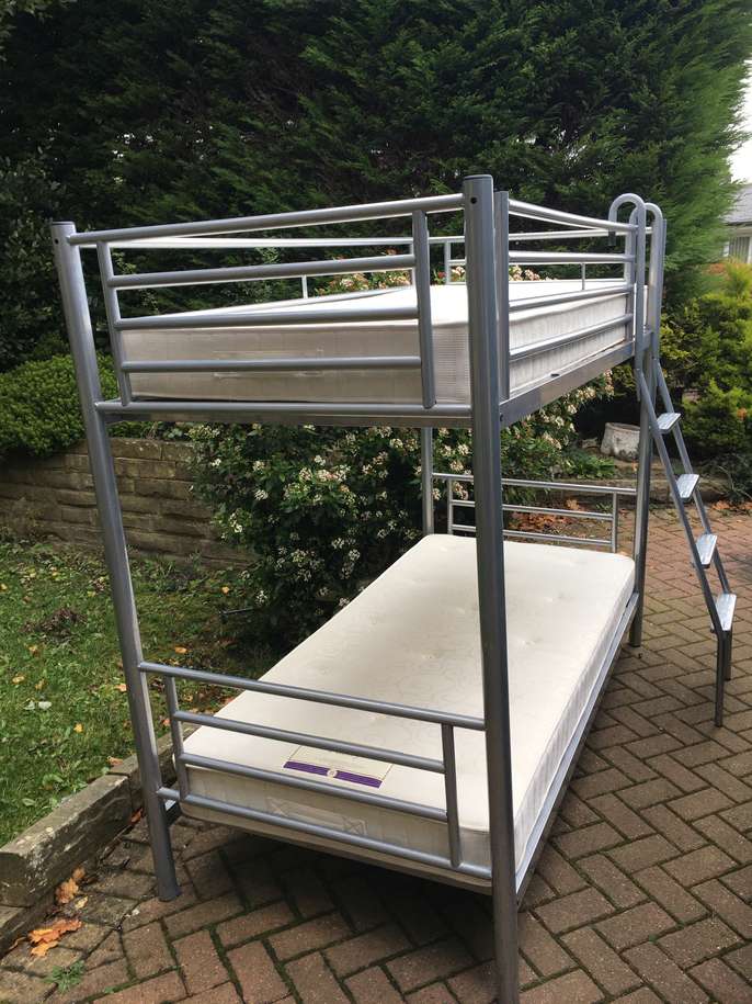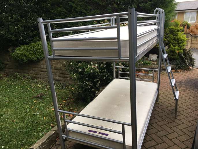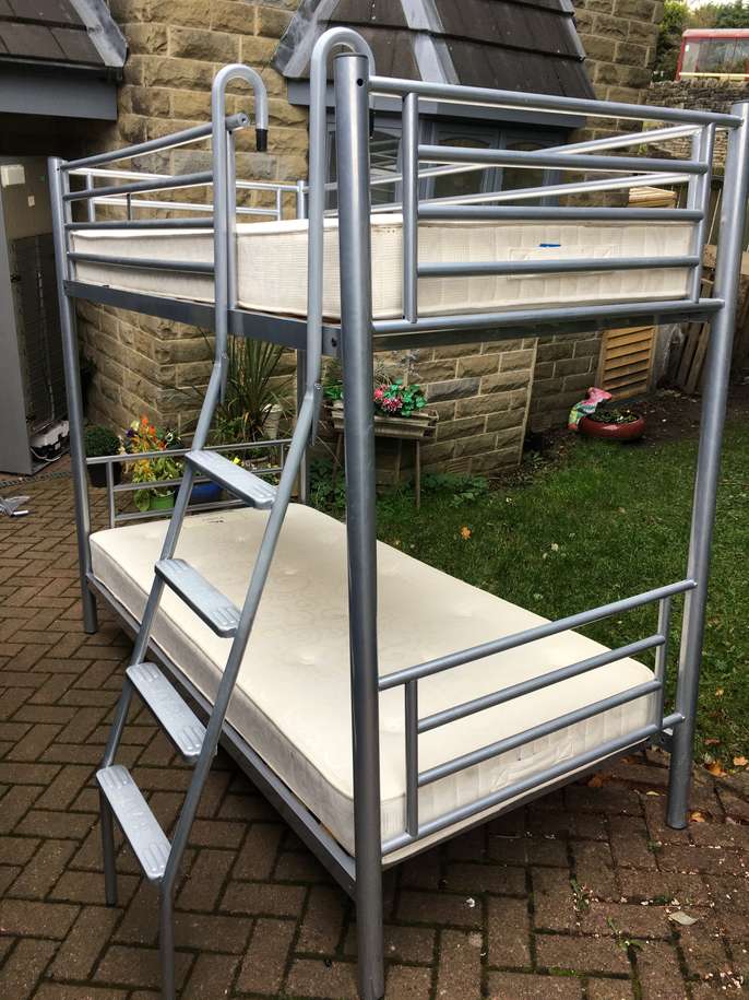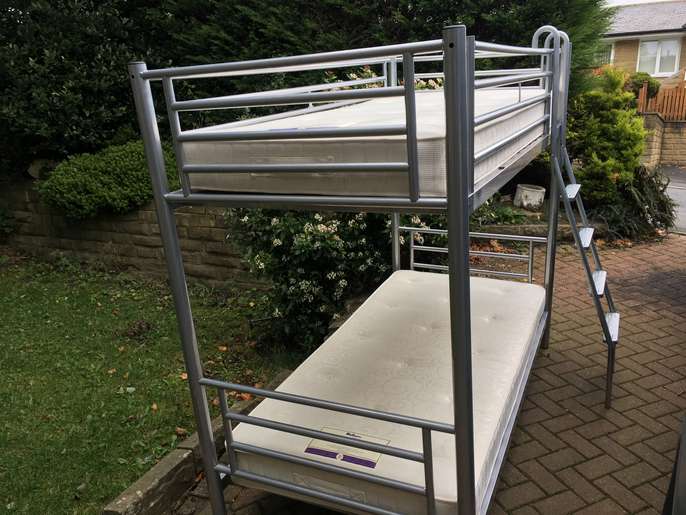 These quality jay-be bunk bed comes with 2 good relyon unilink thick sprung matresses from a pet free/smoke free home the metal frame is 195 cm long by 90 cm wide i can deliver to the local halifax/bradford area for a £15 delivery charge