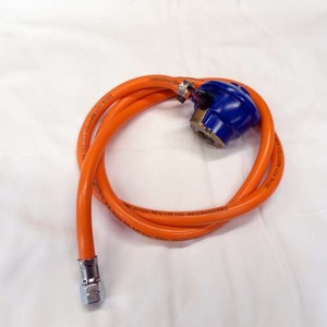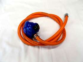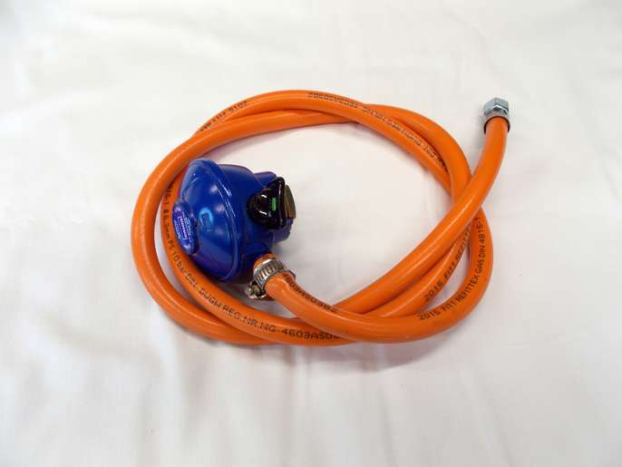 Butane clip on gas regulator with a 1.4m hose and a 1/2" connector. Can be left in porch.