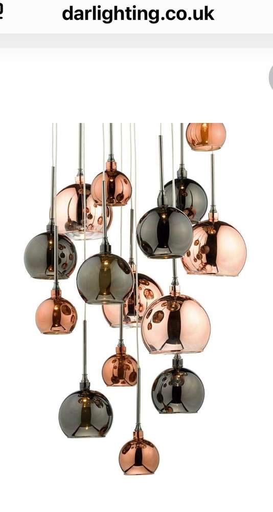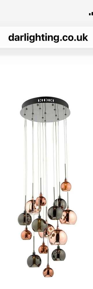 3 x aurelia 15lt cluster pendants black chrome and copper /bronze glass. Measurements on dar lighting website cost £516.00 each . £75 each or £200 for the 3