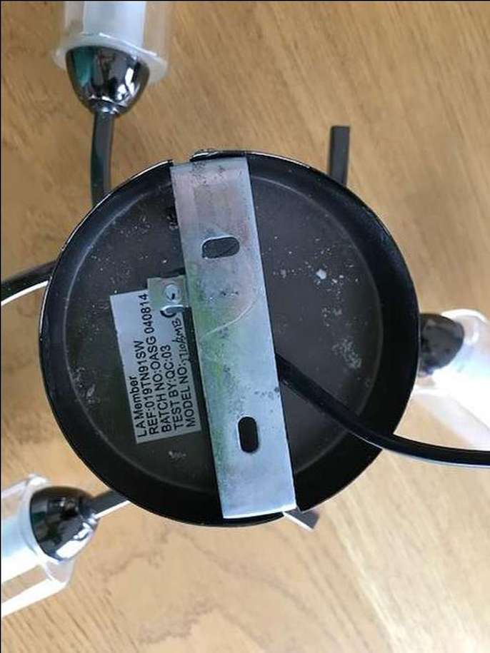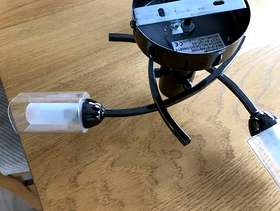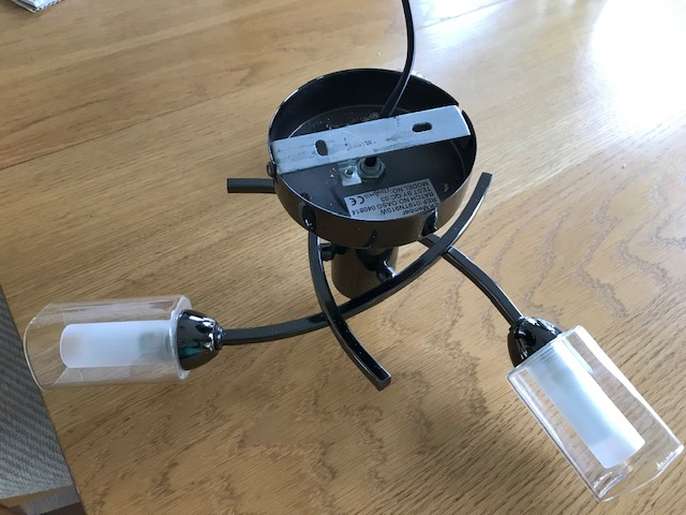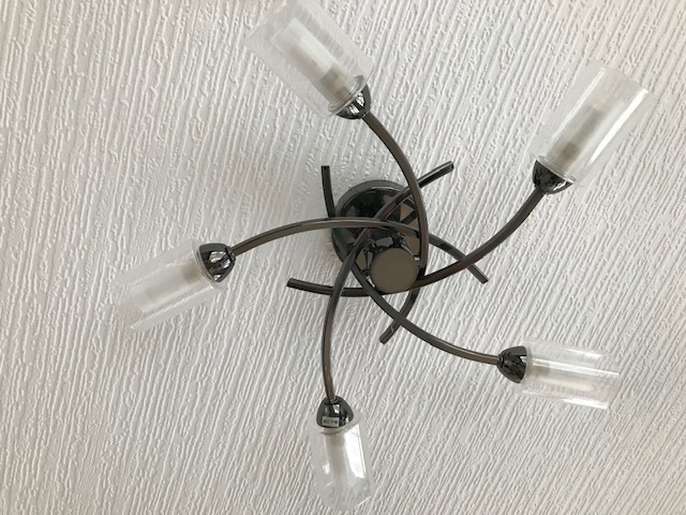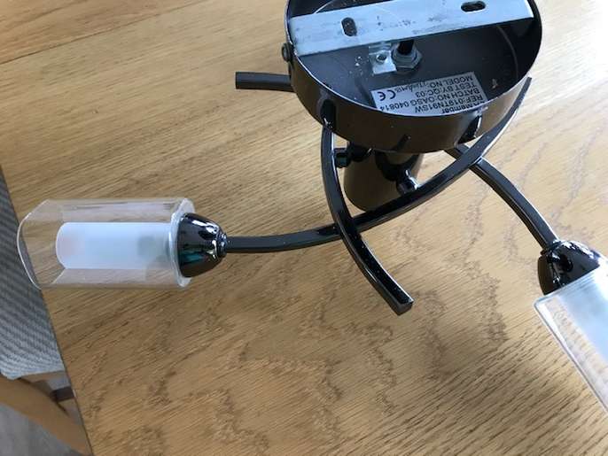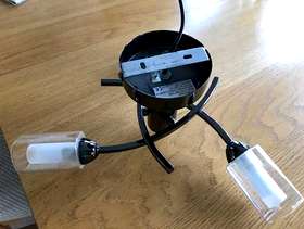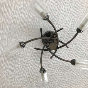 Silver/brown metal ceiling light. Has three glass cylindrical shades complete with LED bulbs. Lights intertwine on metal stems and hang approx. 15cm from ceiling. Excellent condition and in full working order.